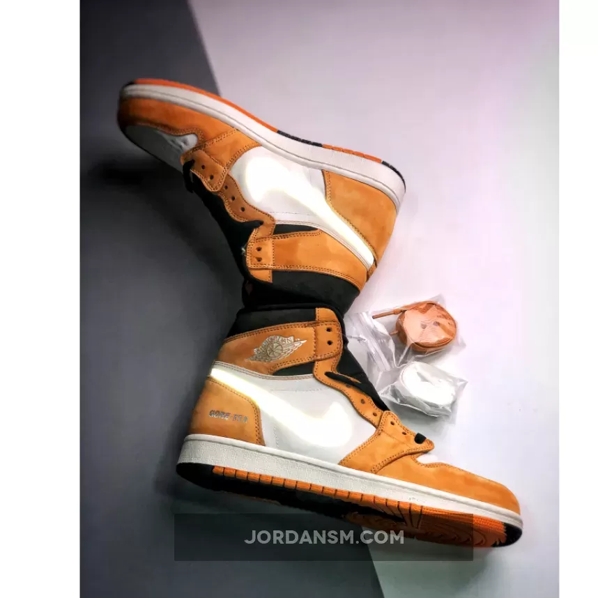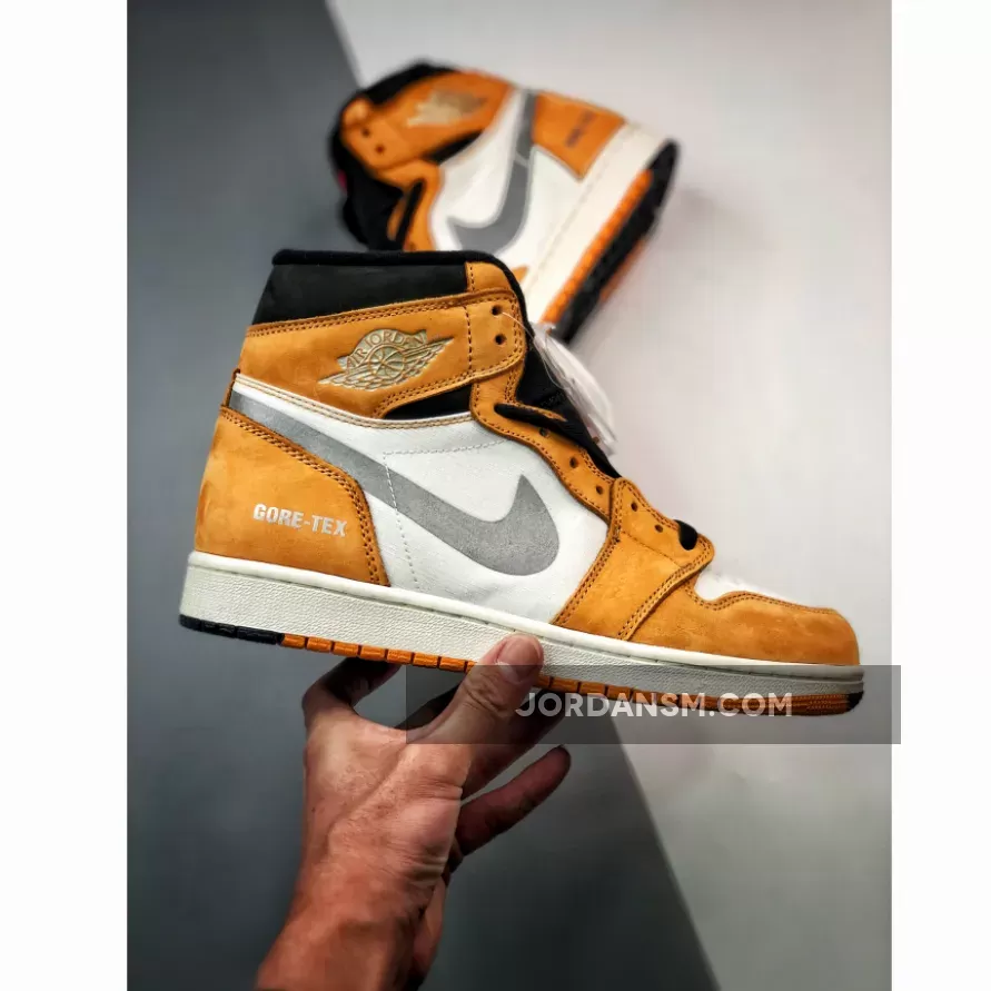 The Air Jordan 1 High Element GORE-TEX Light Curry features a white GORE-TEX upper with Light Curry Durabuck overlays, black collars, and reflective Swooshes. At the heel, GORE-TEX branding highlights the designs weatherproof technology. From there, a matching Air sole completes the design.