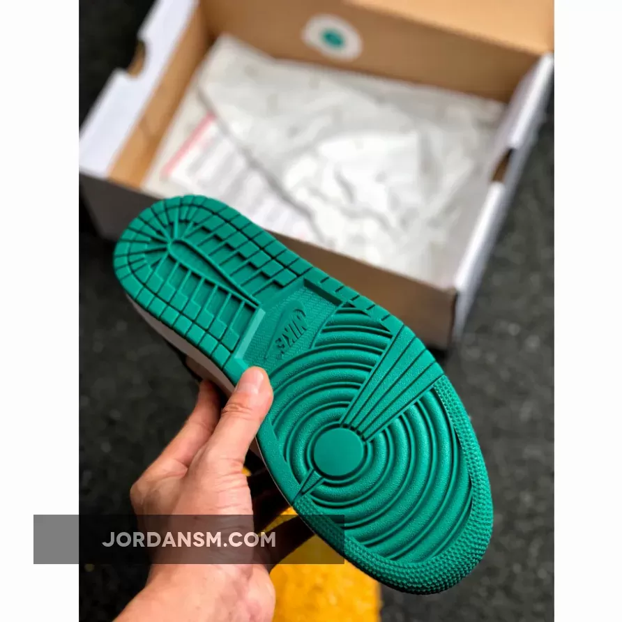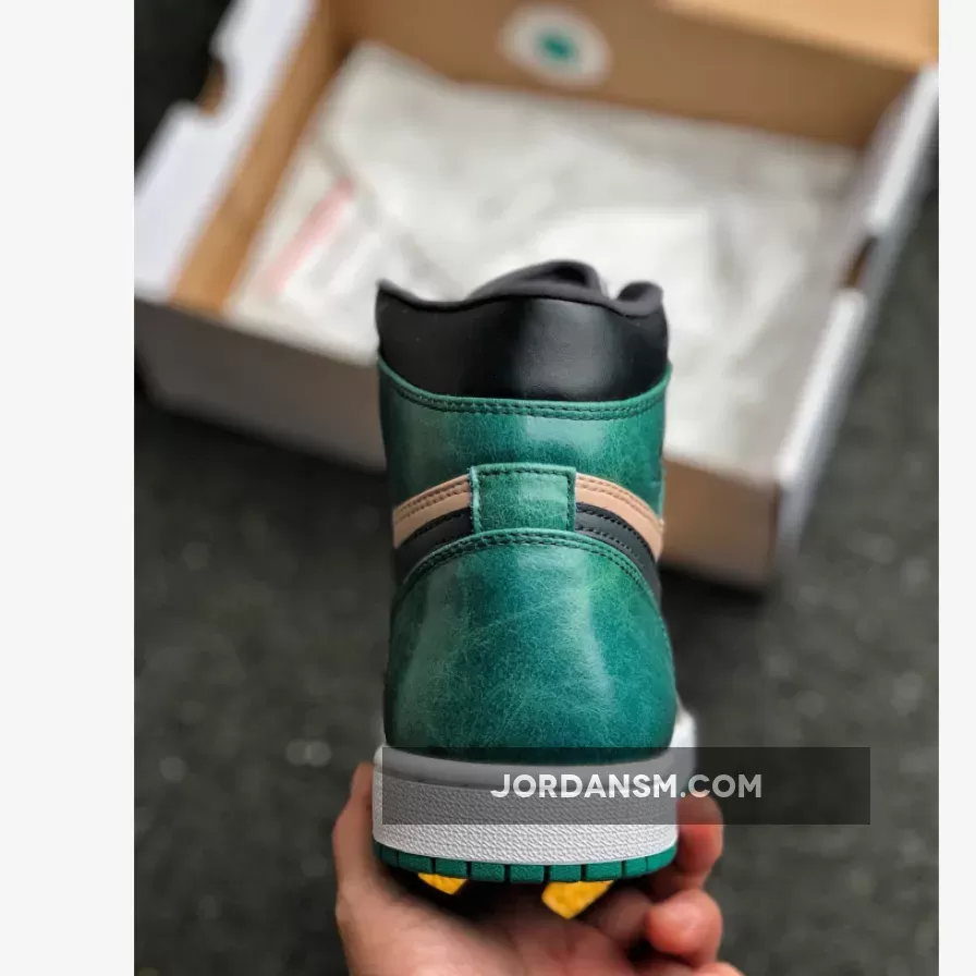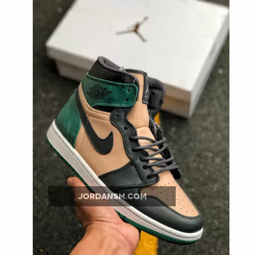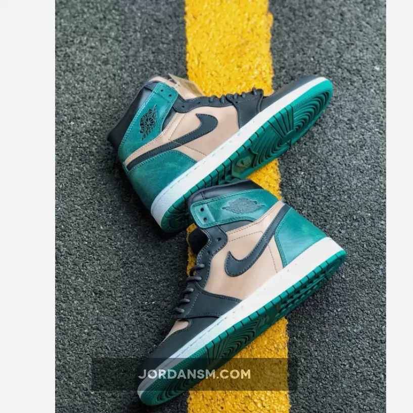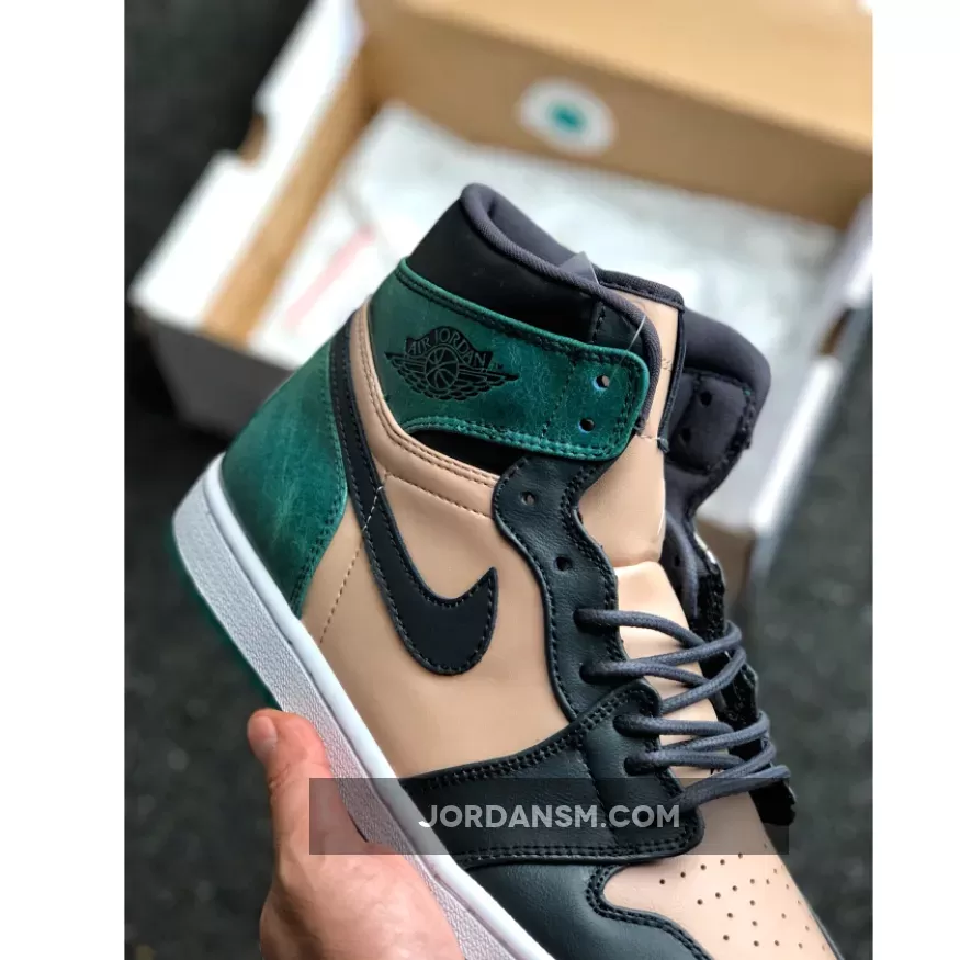 Looking closer this Air Jordan 1 features a shade of Pink across the leather base while Black leather lands on the overlays, eyestays and Swoosh logo. Highlighting this pair is Metallic Green cracked leather on the ankle overlay and across the heel.