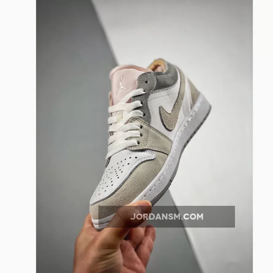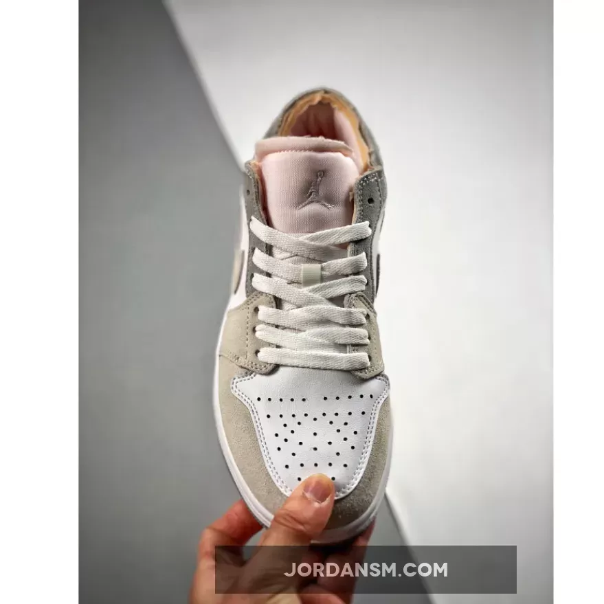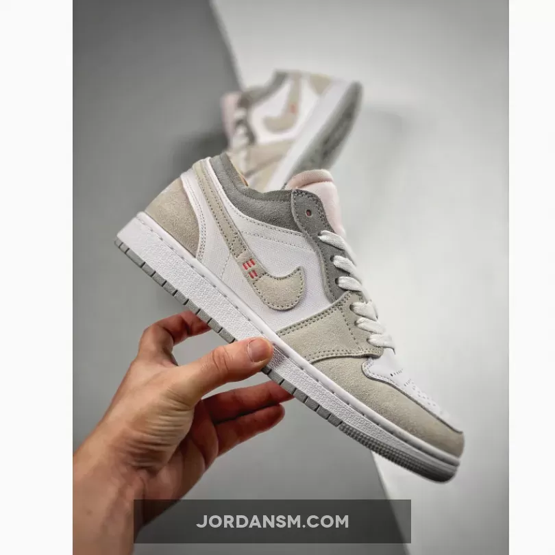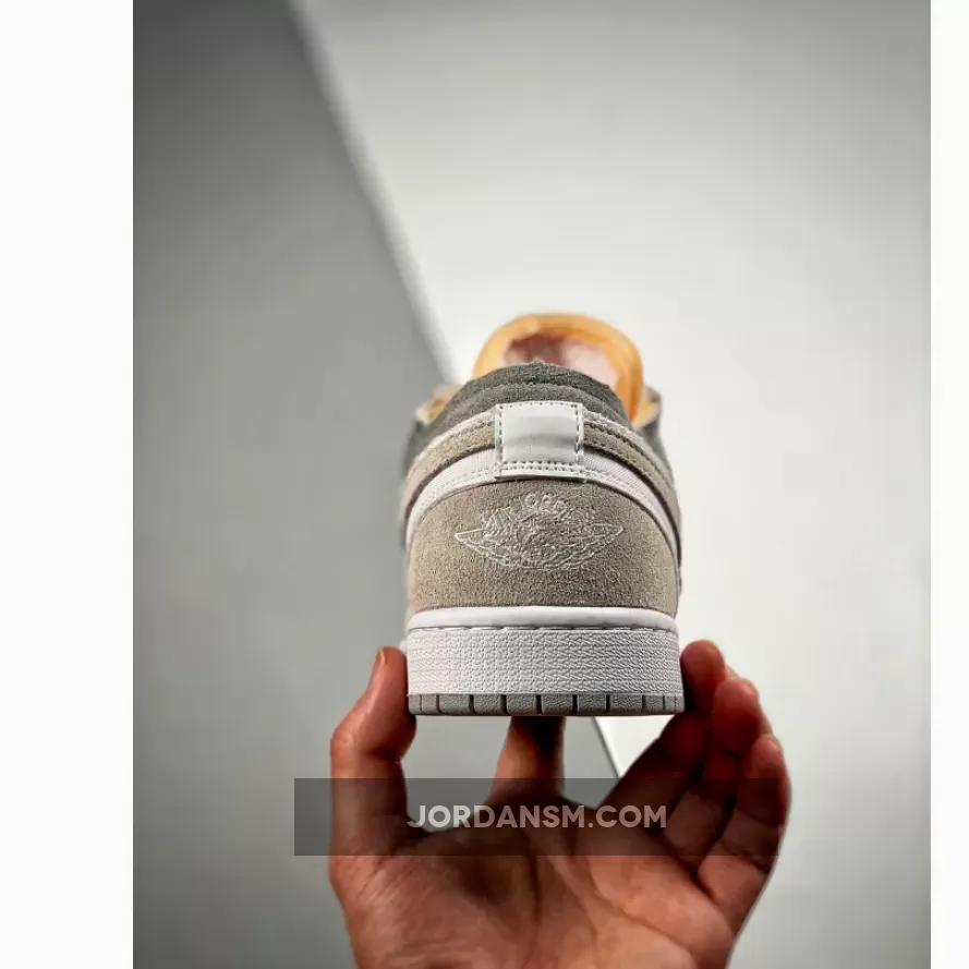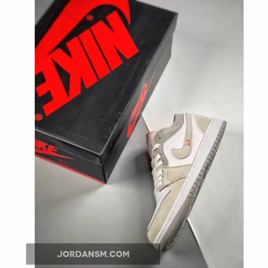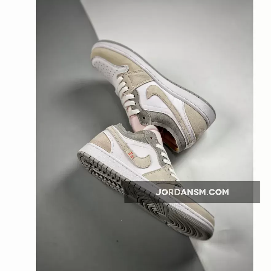 Boasting a deconstructed look, the Jordan 1 Low Inside Out Cream White Light Grey features a light grey smooth leather upper with tonal grey Durabuck overlays and Swooshes. Orange sashiko style stitching on the Swoosh adds a pop of color against a neutral backdrop. At the base, a white and grey Air sole adds the finishing touch.