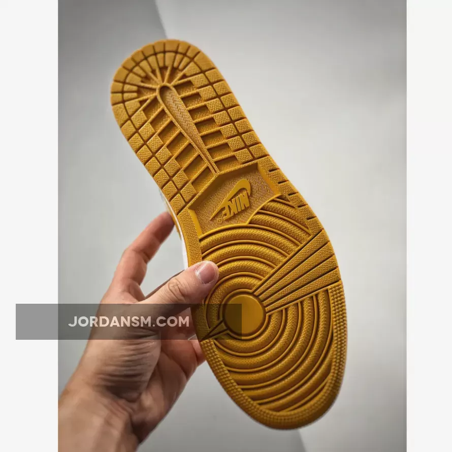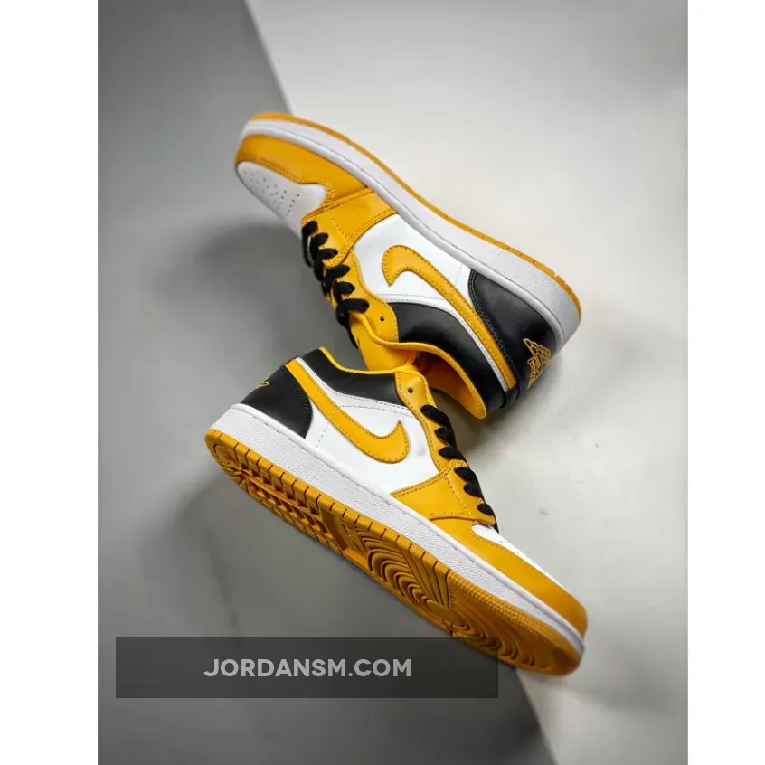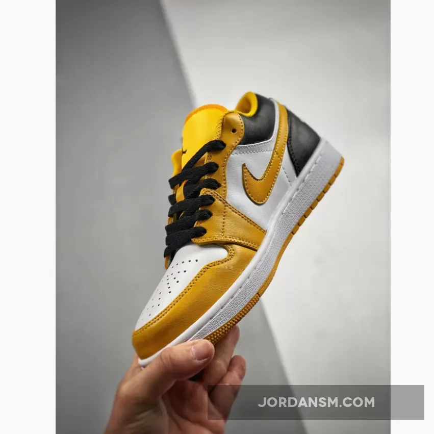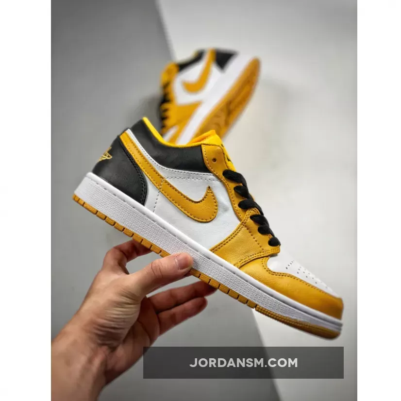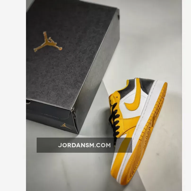The latest Air Jordan 1 Low release will give you serious bumblebee vibes. Take a closer look at the Air Jordan 1 Low University Gold. This AJ1 Low looks absolutely cheerful with a “White/ Black/ University Gold” colour scheme. The toe box and quarter panels are in smooth “colourless” white leather. The toe box, mudguard and eye stay panel are all in the titular University Gold. The collar and heel counter, on the other hand, are pitch-black as are the laces.