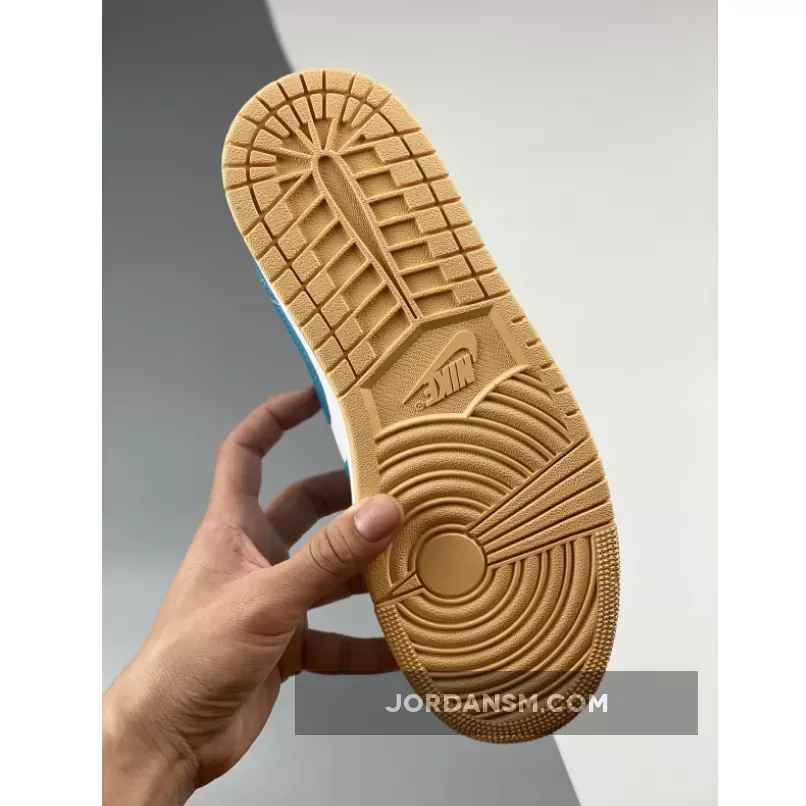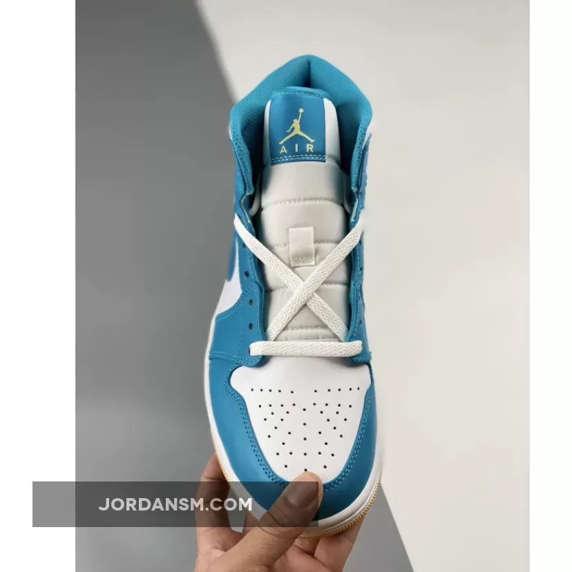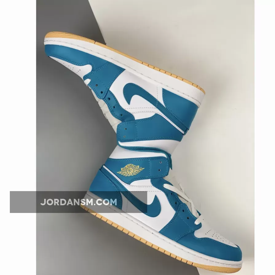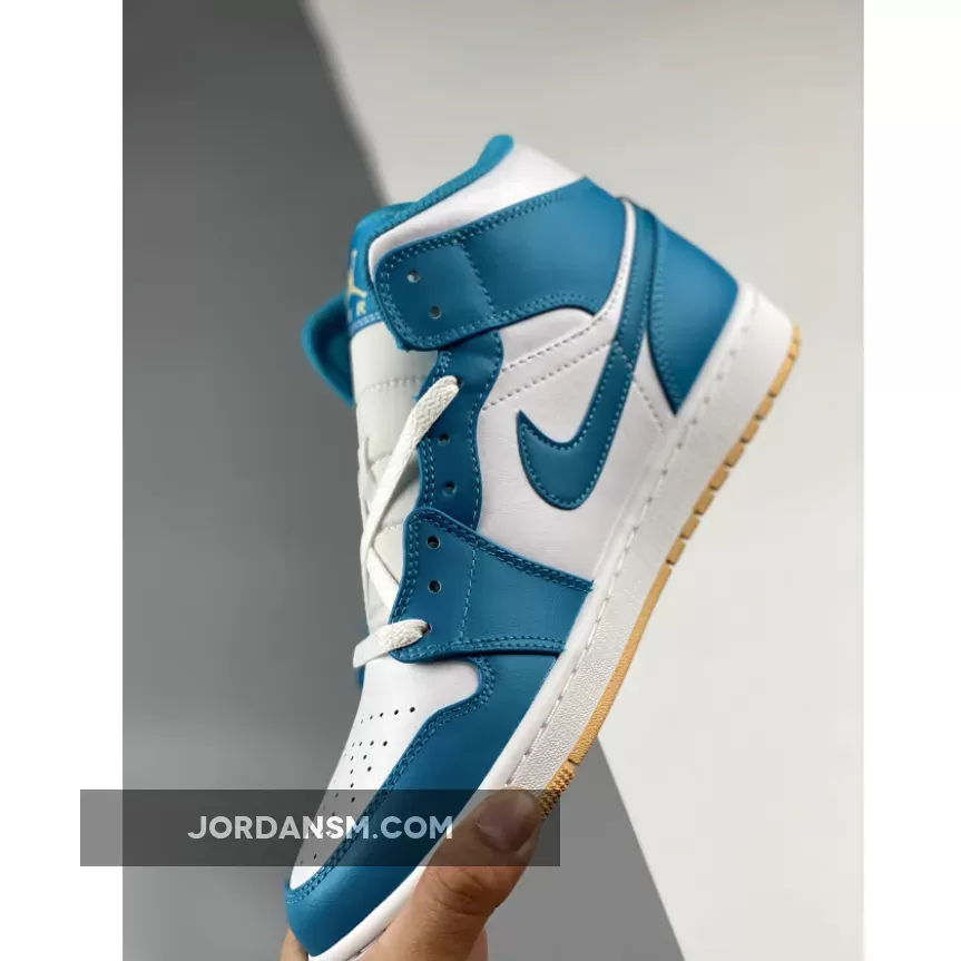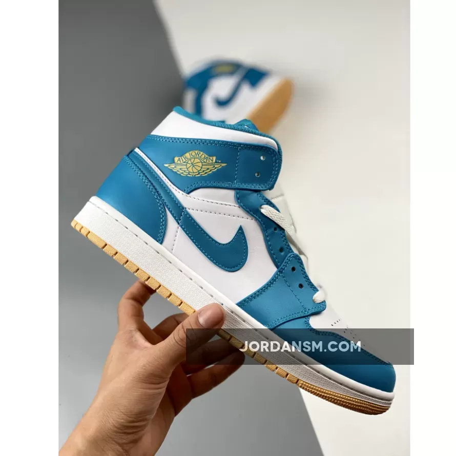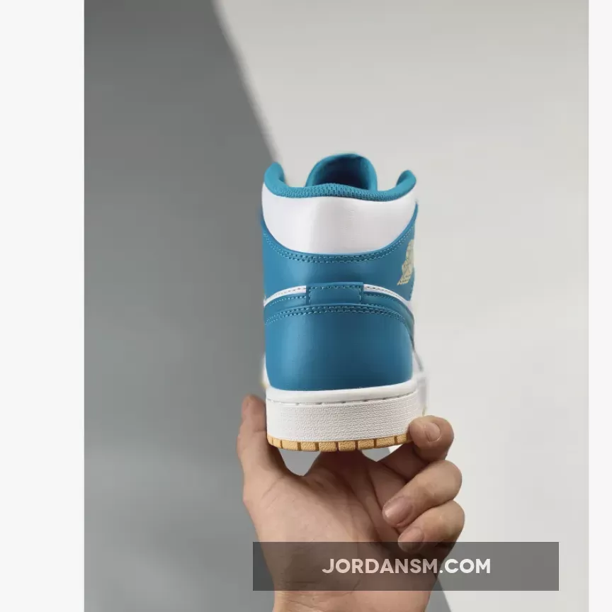 The Jordan Brand’s most influential and memorable model, the Air Jordan 1, dons an appealing shade of blue with a touch of pastel peach. Take a closer look at the Air Jordan 1 Mid White Teal. This mid-cut AJ1 has a “colourless” white smooth leather base, matching the laces. This backdrop paves the way for the stunning shade of Teal blue of the overlays on the toe cap, the mudguard, the eye stay panel, the heel counter, the collar flaps and the profile Swooshes that glide across both mid-panels of the shoe. The tongue lining and sock liner both follow suit. Light peach joins the mix on the “Wings” logo stamped on the lateral sides of the collar flaps.