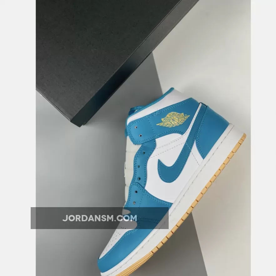 Solid color scheme on the Air Jordan 1 Mid Aquatone/Celestial Gold-White 🤩. Love the combination of white and blue, with a touch of peach for extra pizazz ✨. Excellent craftsmanship as always from Nike 👌. #JustDoIt #SneakerHeadHeaven #AJ1Addict