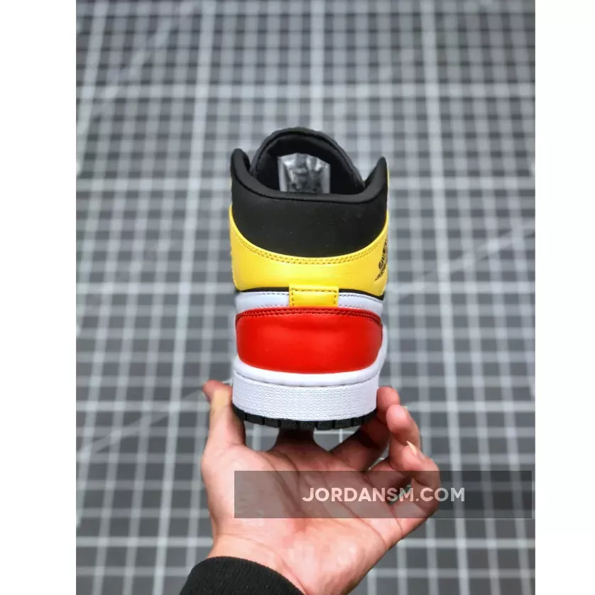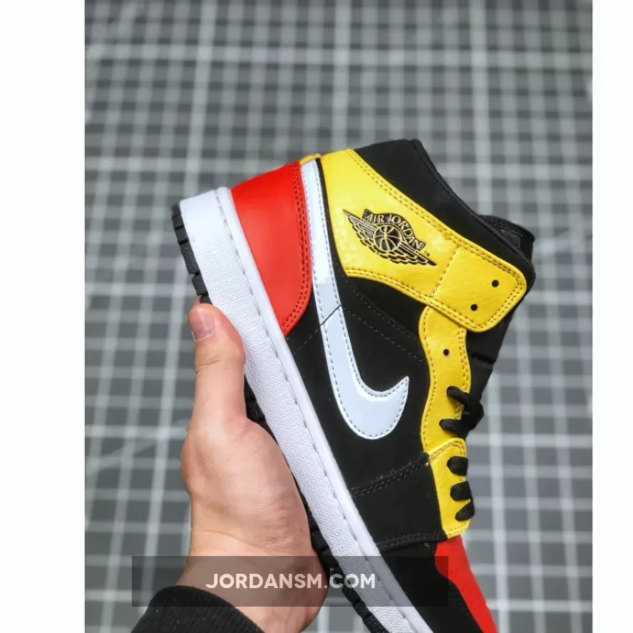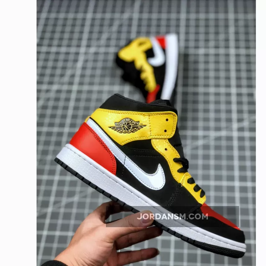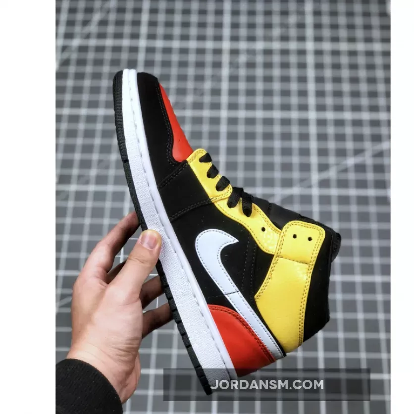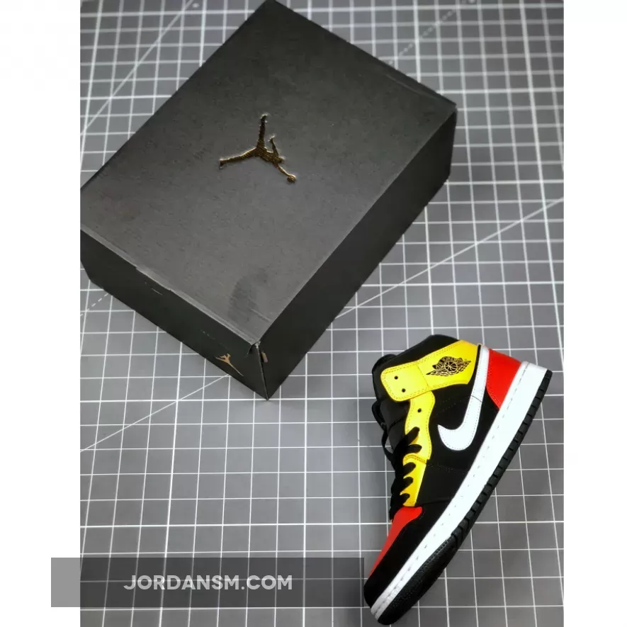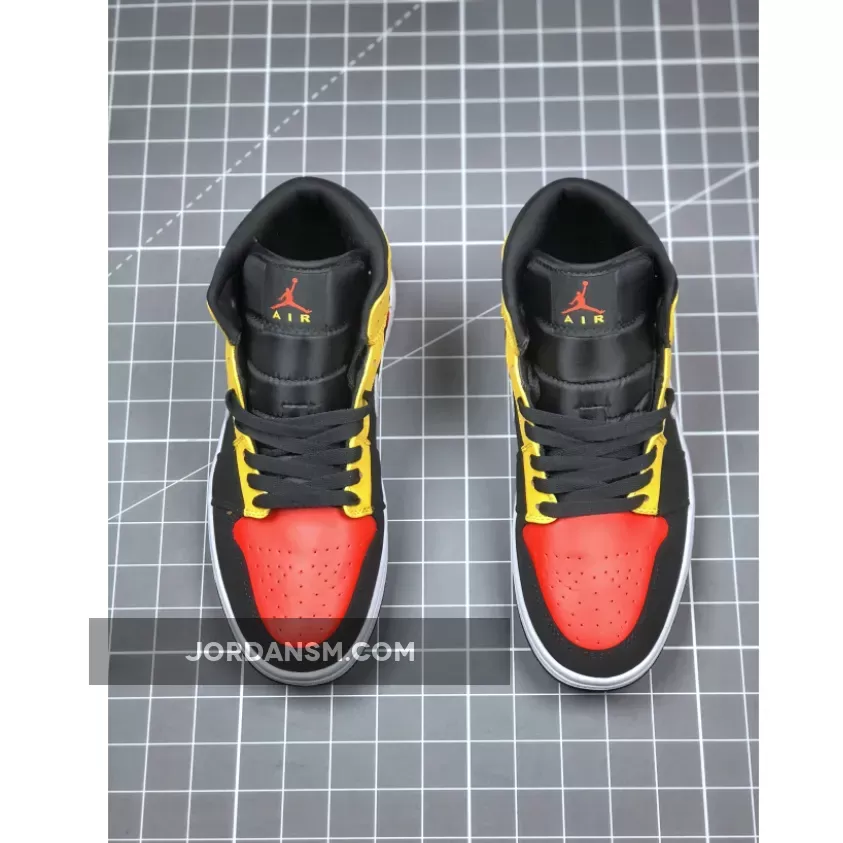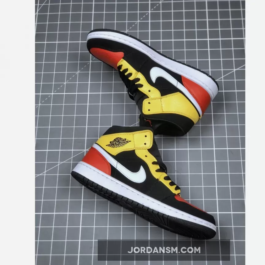 Dressed in a Black, Amarillo, White, and Team Orange color scheme. This mid-top Air Jordan 1 features a Black nubuck base with Orange leather on the toe and heel, while Yellow leather covers the ankle area and eyestay. A White leather Swoosh logo on the sides atop a White midsole and Black rubber outsole completes the design.
