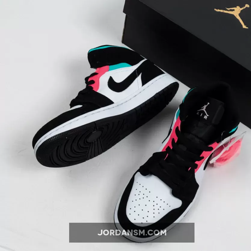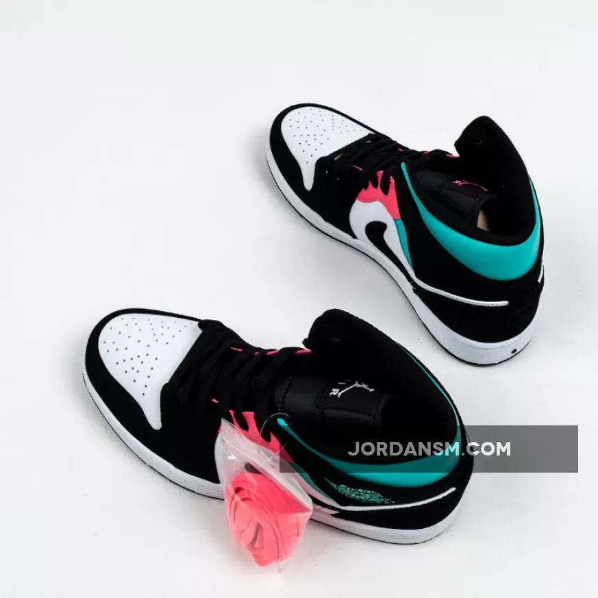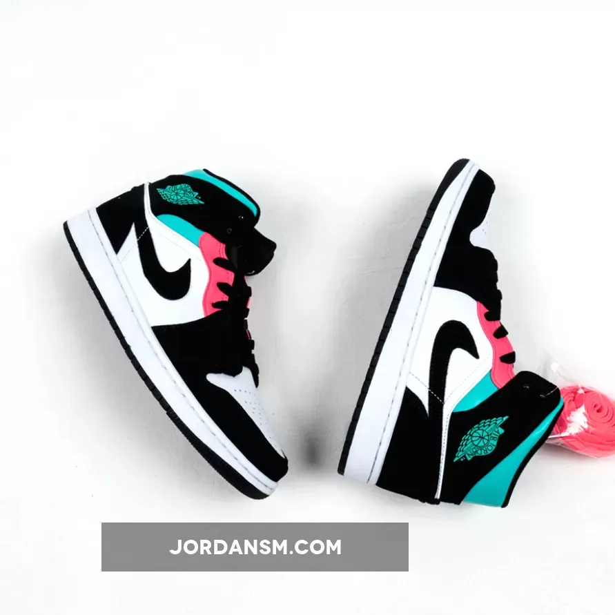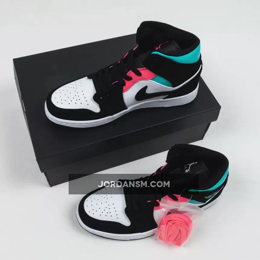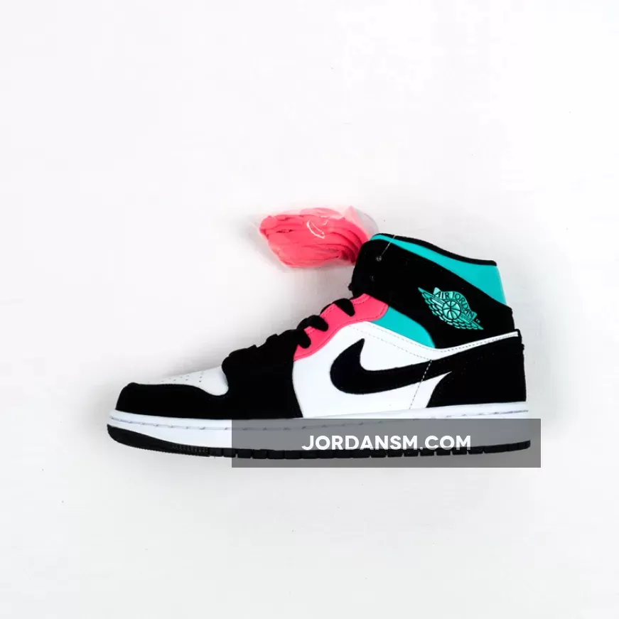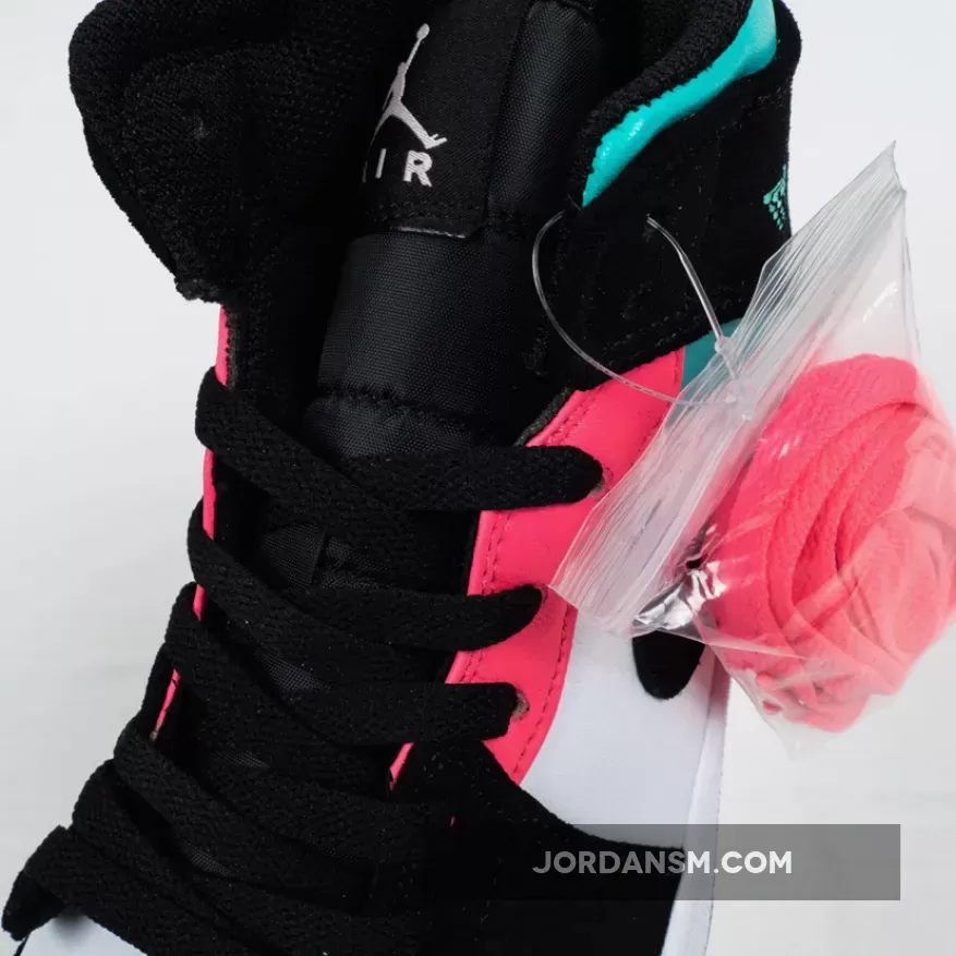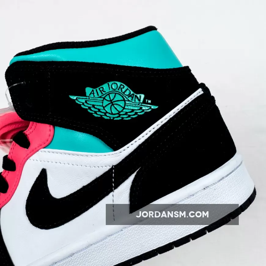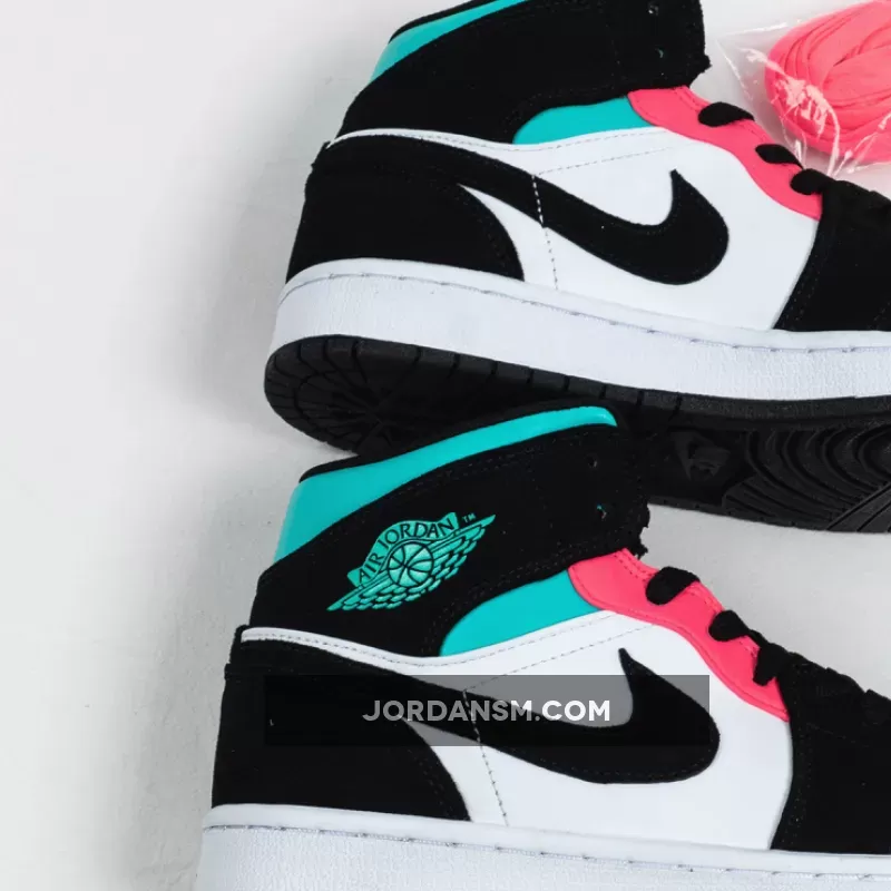 Looking closer this Air Jordan 1 Mid comes with White leather across the base while using a Black long hair suede on the overlays. Making the ‘South Beach’ theme is the use of Pink and Teal accents on the eyestay, ankle, Wings and tongue branding. Other details includes a White midsole and a Black rubber outsole which finishes the look.