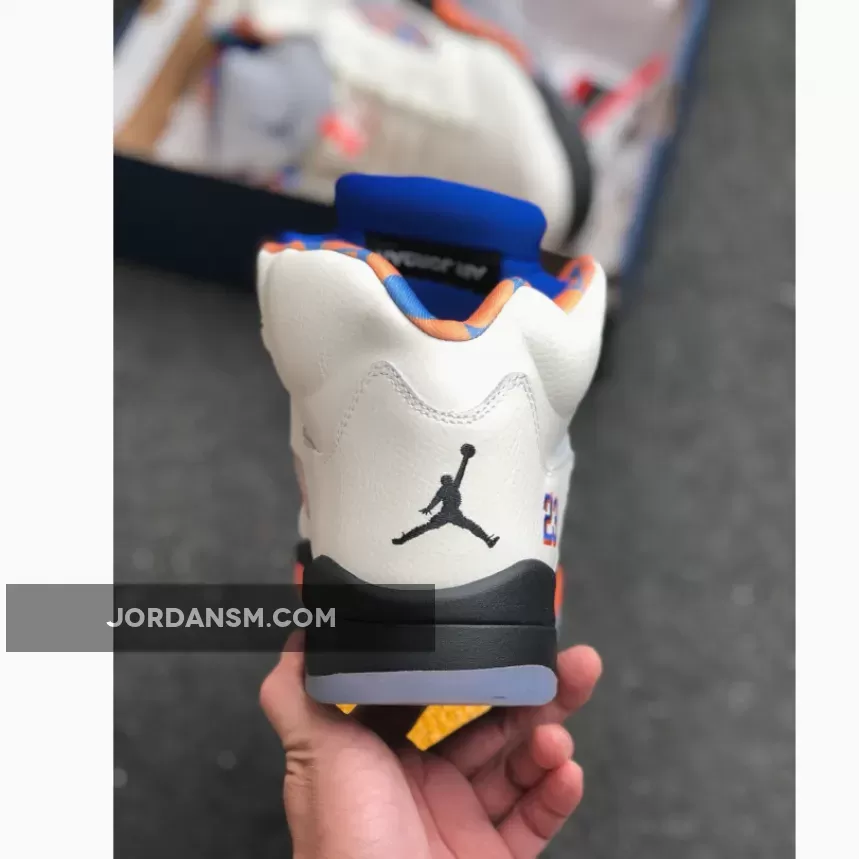 This Retro Air Jordan 5 sneaker features a sail leather upper, a reflective tongue, a black midsole, orange and royal accents, and a original graphic along the quarter mesh panels. The shoes inscription is complemented by an icy blue translucent outsole, and the “23” PE style number is embroidered on the heels. AIR-unit soles complete the design.