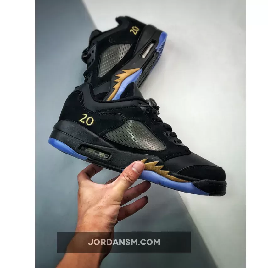 This special edition Air Jordan 5 Low features a Black nylon upper with butter-soft leather overlays. Gold detailing appears on the forefoot teeth, 3M reflective tongue branding, and lateral “20/21” branding, along with Smokey Black netting and blacked-out midsoles.