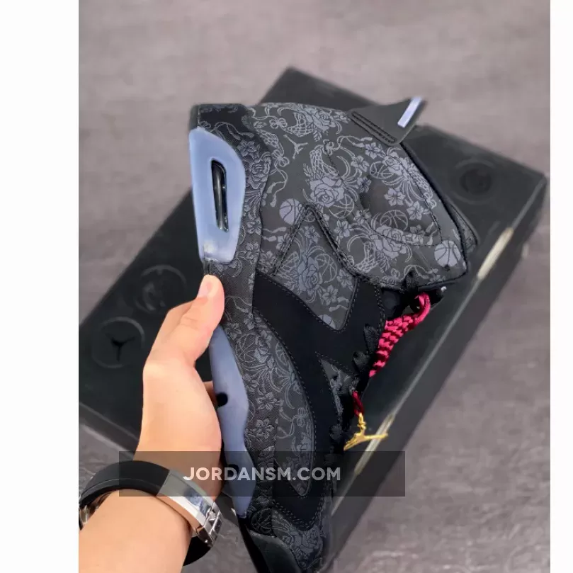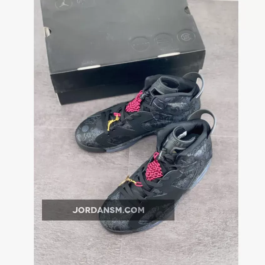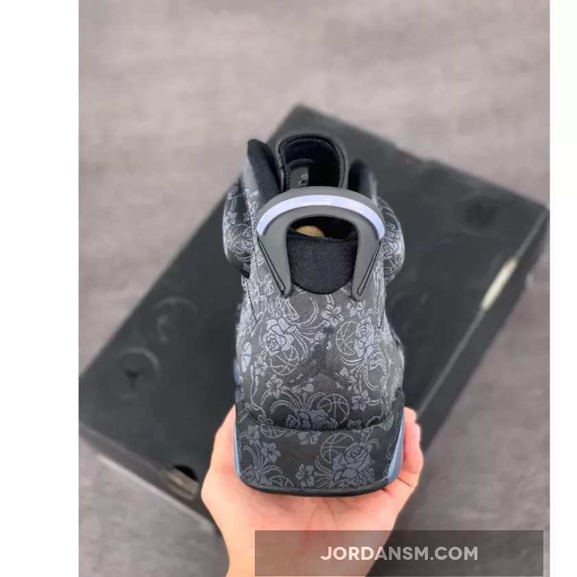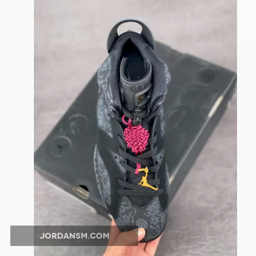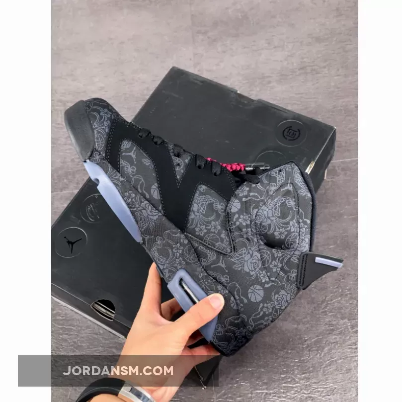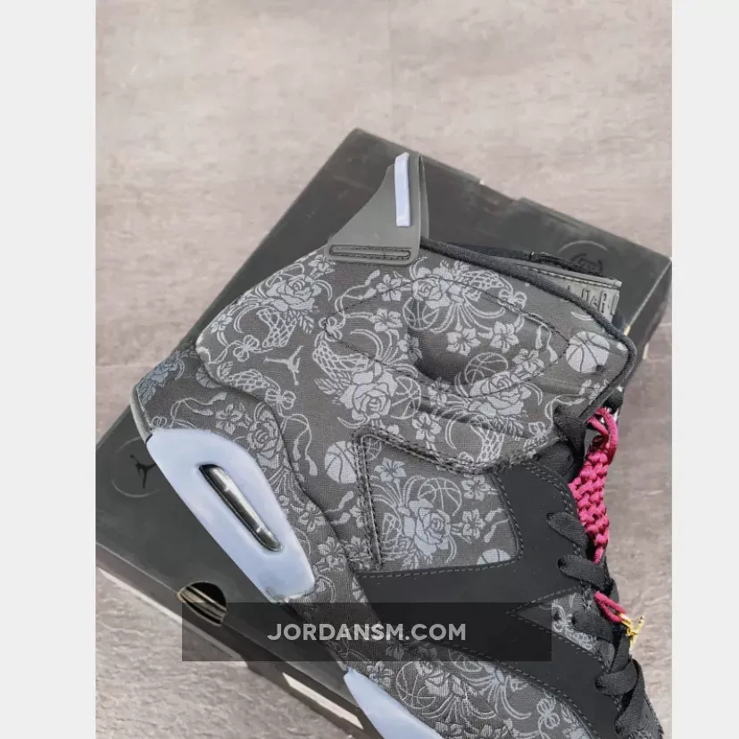 Highlighted with subtle graphics throughout, this Air Jordan 6 features a mostly Black theme. Firstly, the base receives the most attention from the textiles, while graphics of flowers, roses, and even basketballs subtly used. Additionally, Black nubuck then lands on the overlays and midsole, where the graphics placed again. Adding a splash of color is a heart-shaped lace lock-in Red and Metallic Gold on the hangtag. Finally, a Black rubber outsole completes the look.
