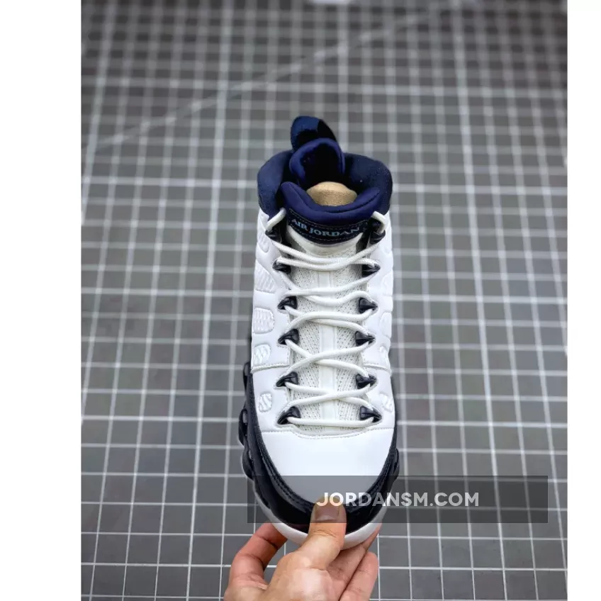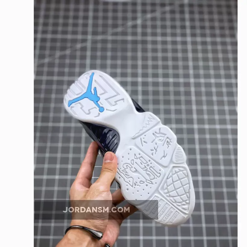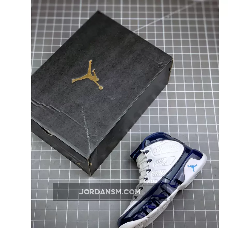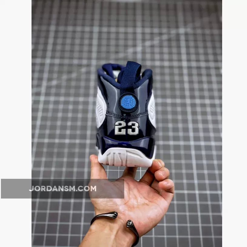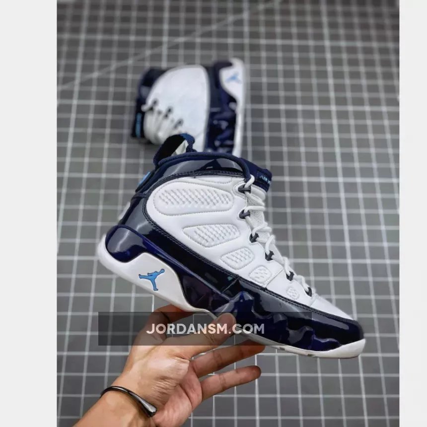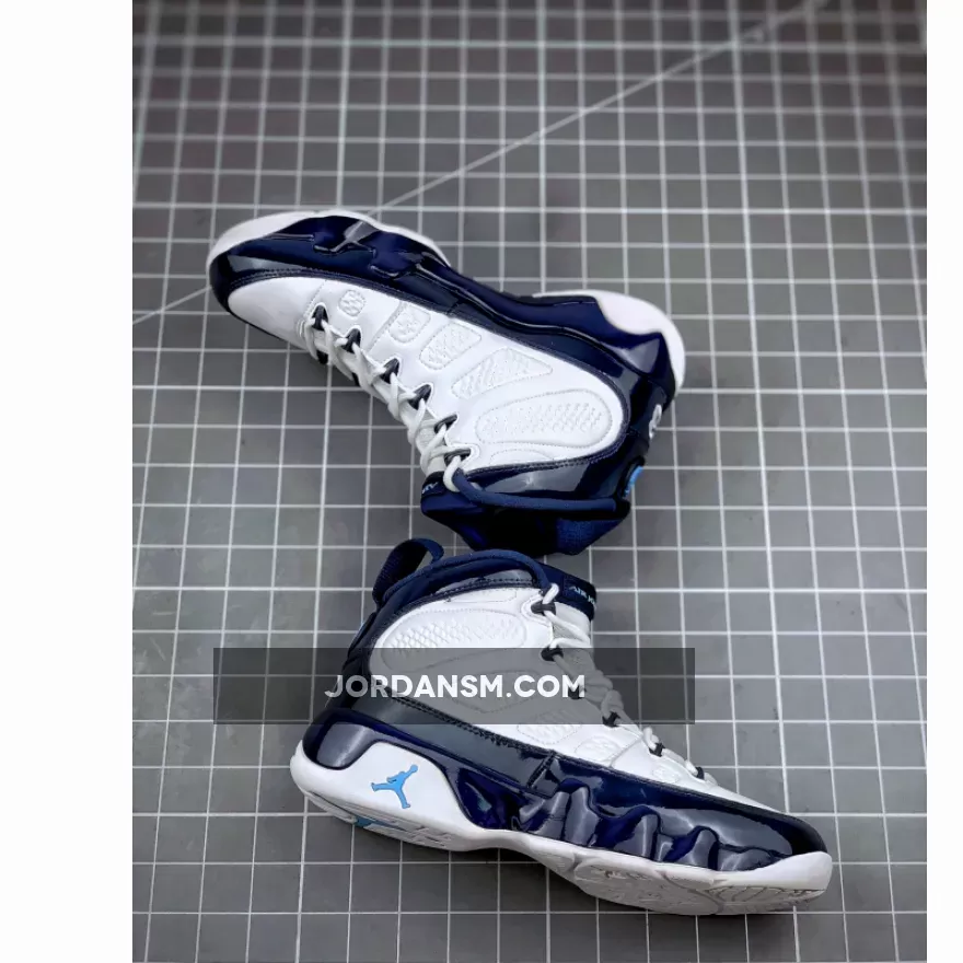 Dressed in a UNC color scheme of White, University Blue, and Midnight Navy. This Air Jordan 9 has a lot of similarities to 2002’s “Pearl Blue” Air Jordan 9 Low as well as the high sample.