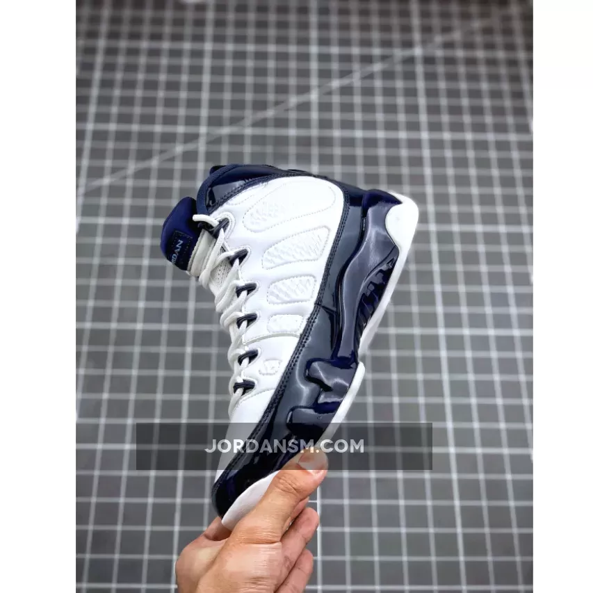 The retro features a White leather upper with Midnight Navy patent leather overlays and University Blue accents on the branded areas.