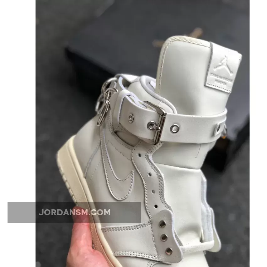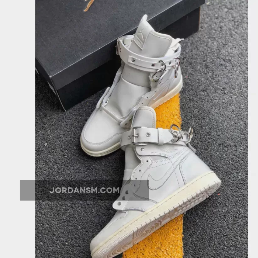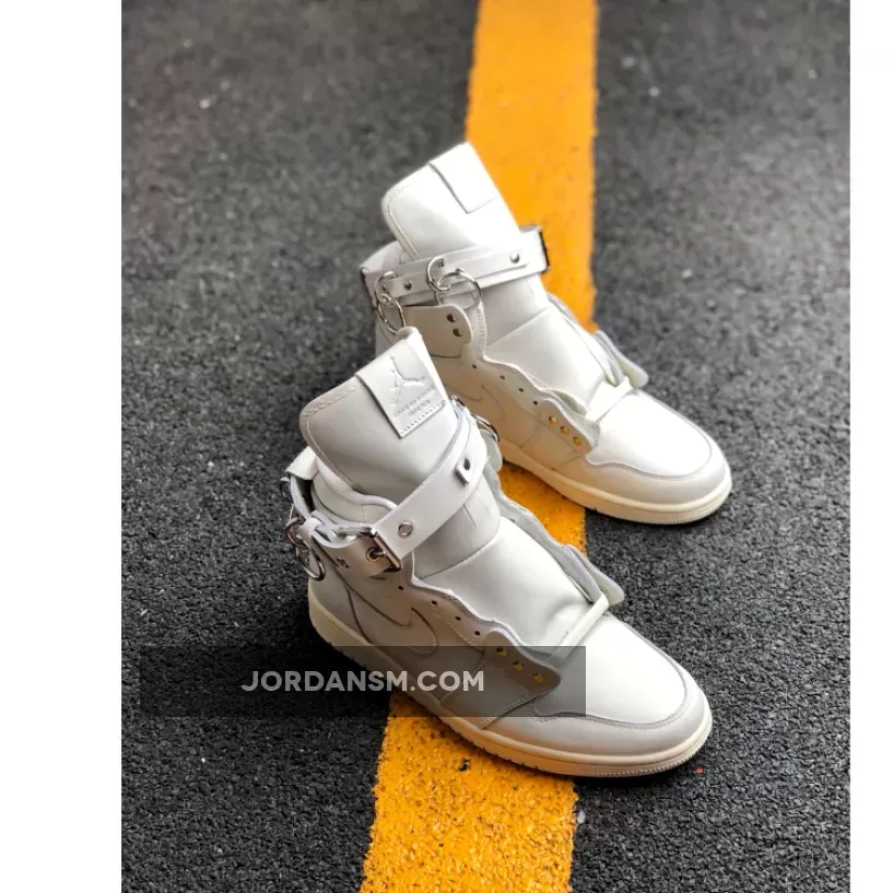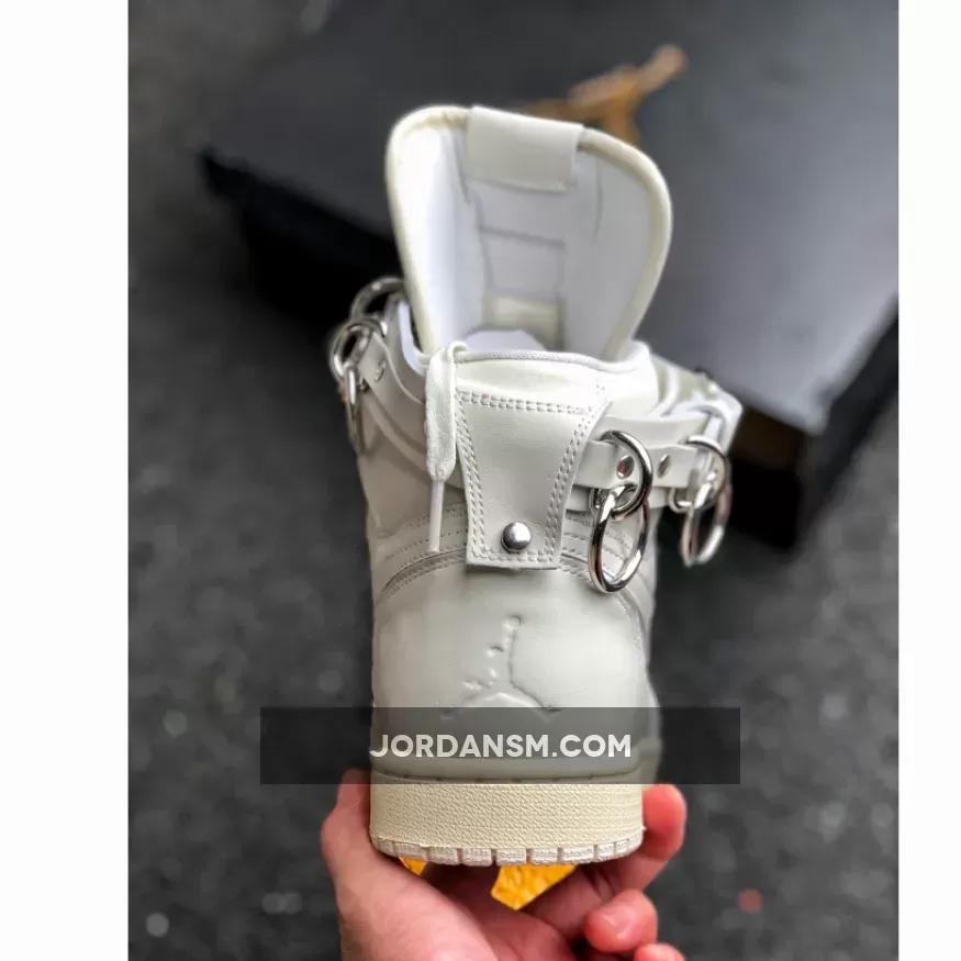 Taking design cues from the classic motorcycle boot, the Comme Des Garcons X Air Jordan 1 High White is painted in an ultra clean white hue and is crafted from premium smooth leather. Punk influences make their way to the chunky ankle strap and metals studs, and an elongated tongue has also been added for a look that is sure to turn heads.