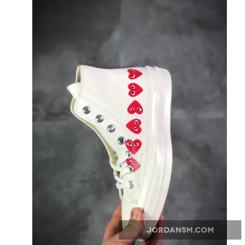 The new design features PLAY’s iconic heart motif, which appears is repeated nine times in a pattern around the base of the upper on both colorways. As well as the traditional white colorway, the collaborative sneaker is also set to release in a new khaki option, replacing the pack’s usual black colorway.