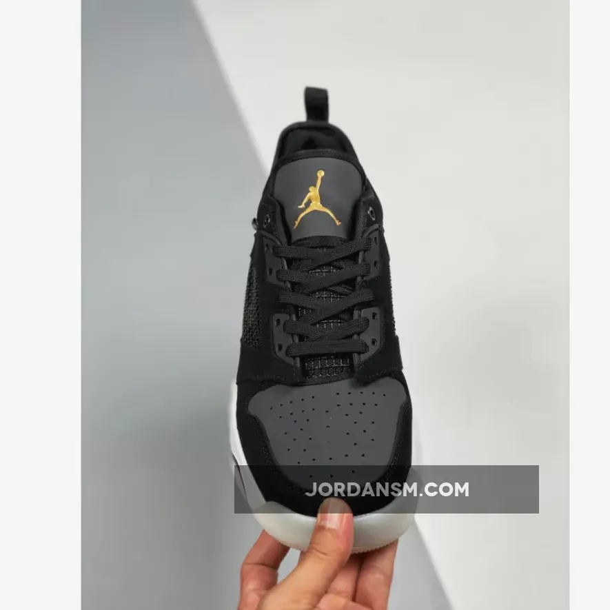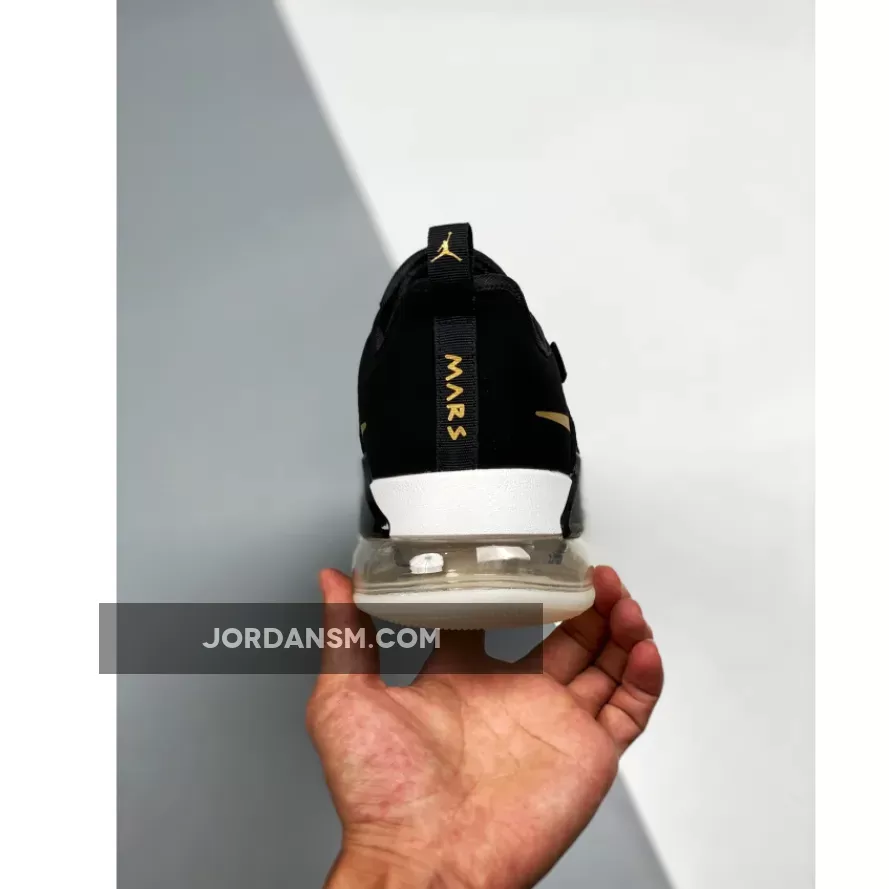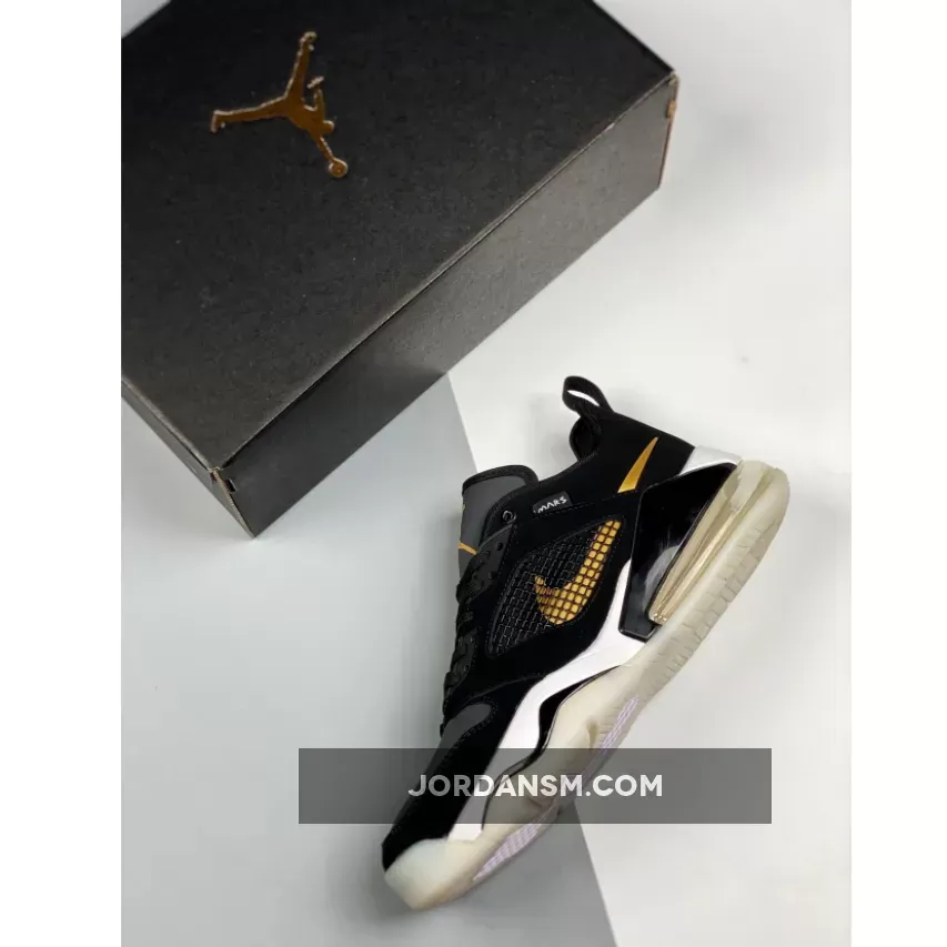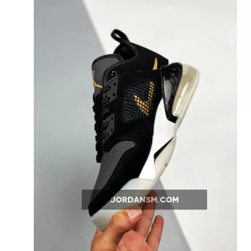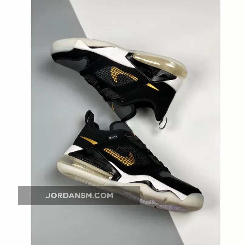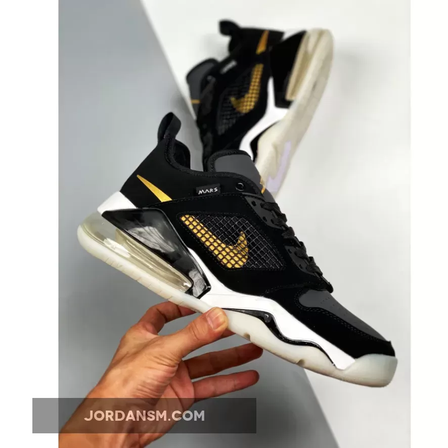 Dressed in a Black, Metallic Gold, Dark Smoke Grey, White, and Pure Platinum color scheme. This Jordan Mars 270 Low features Dark Grey on the toe box and tongues paired with Black nubuck overlays.