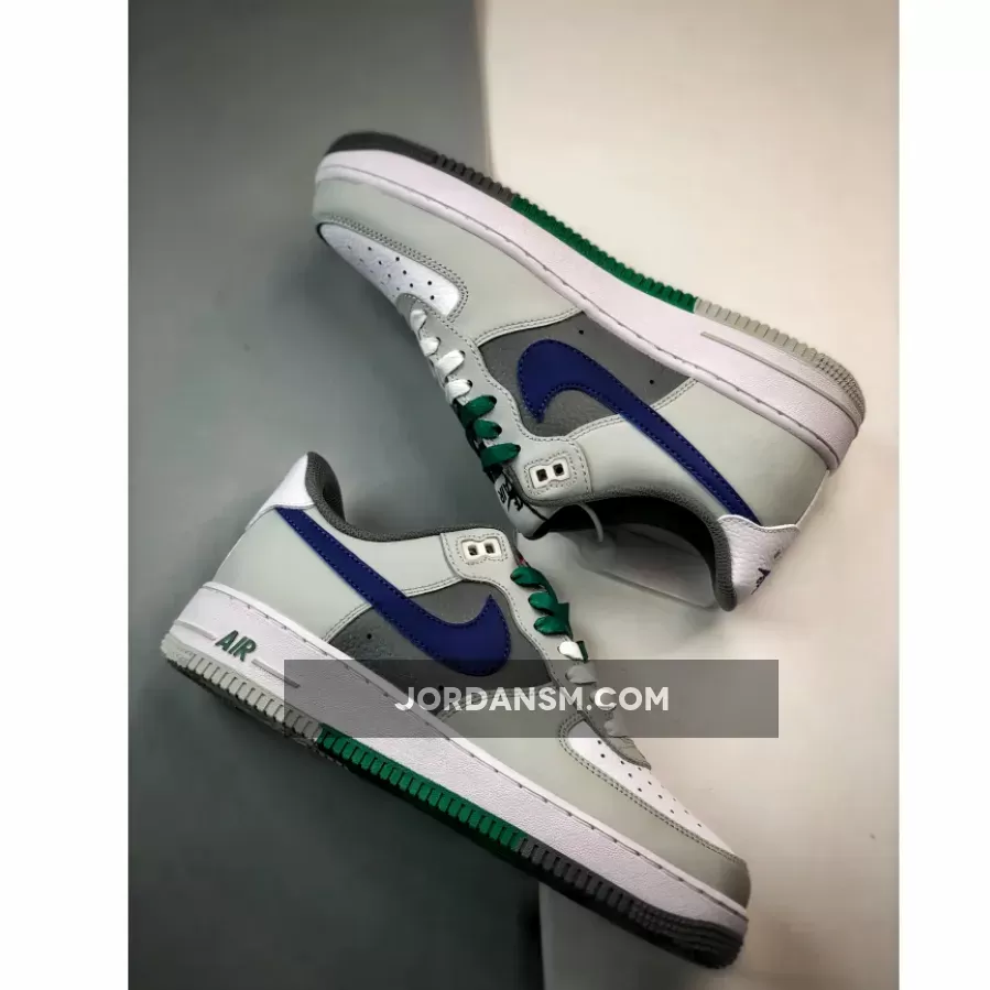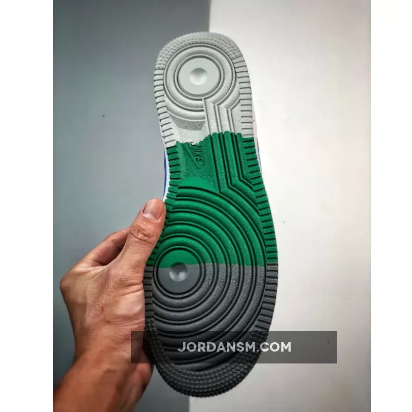 A “Royal Blue” Swoosh adds an uncommon accent to the multi-color composition while further divided color blocking appears at the white/green laces and tread.
