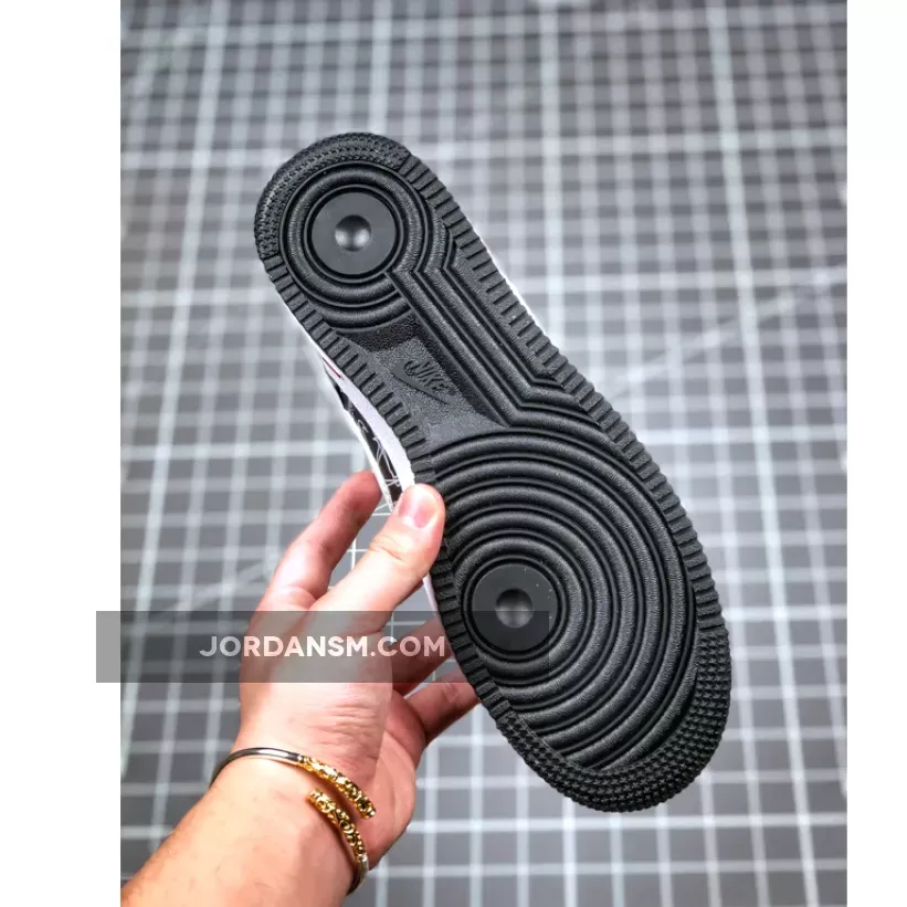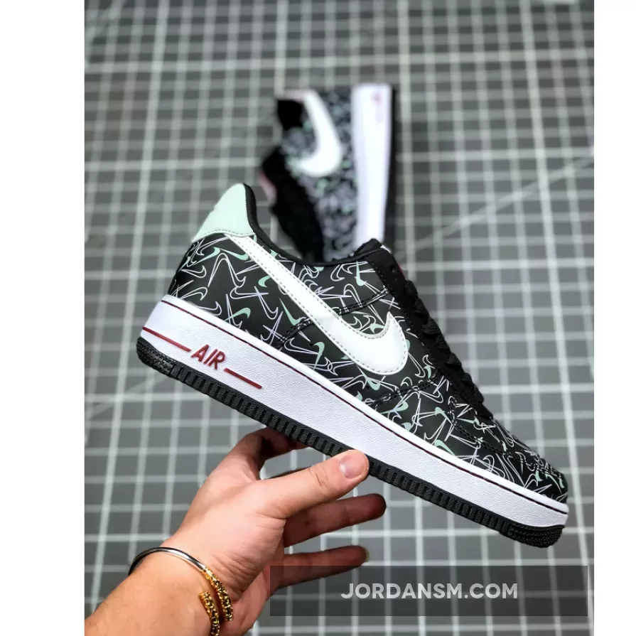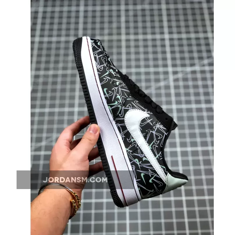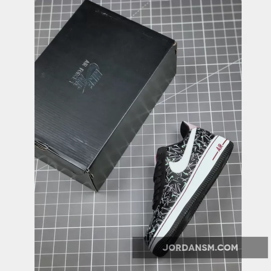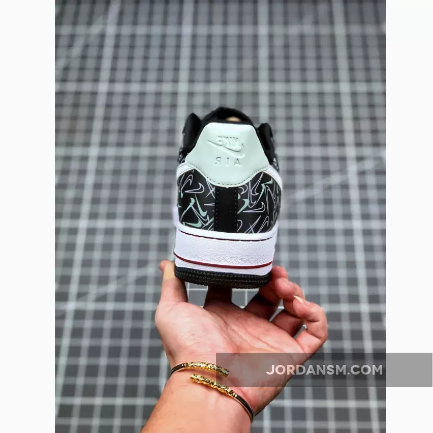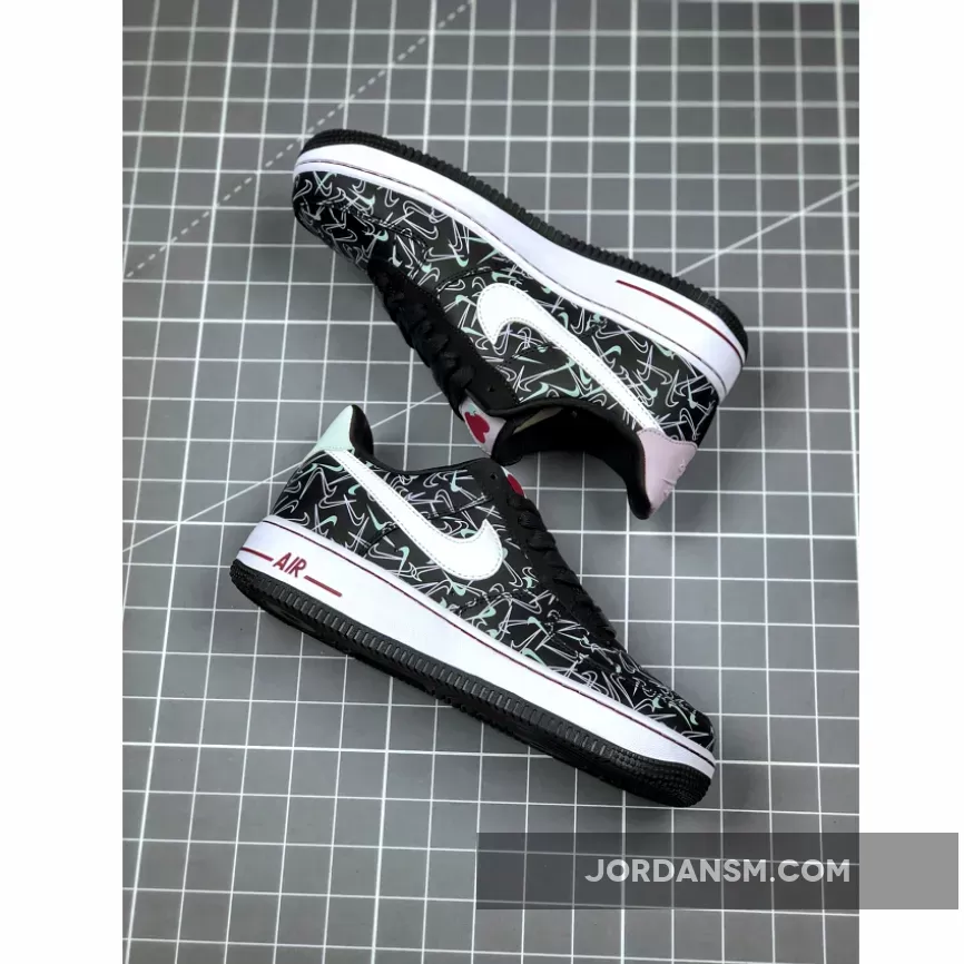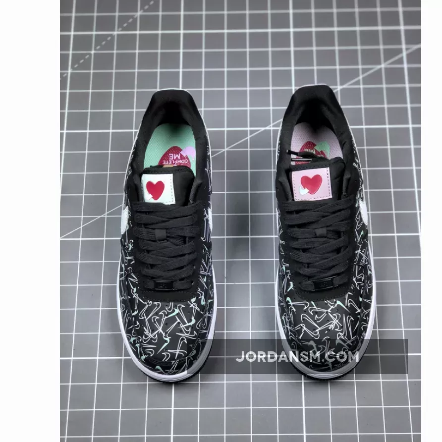 This offering of the Nike Air Force 1 Low features a Black leather upper covered in mini Swoosh logos with White leather Swooshes on the sides. Heart logos on the tongues, Mint and Pink heels and insoles that read, “U Complete Me” completes the design.