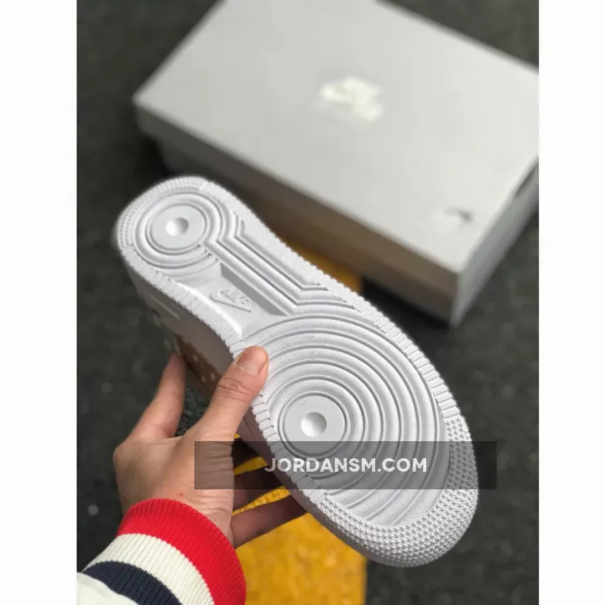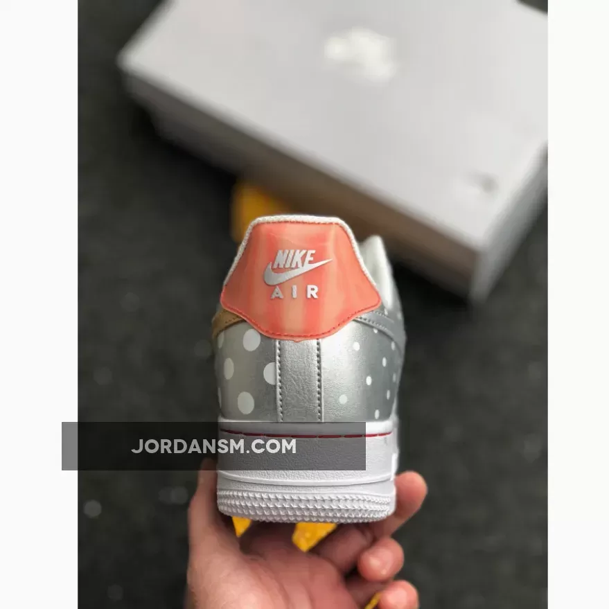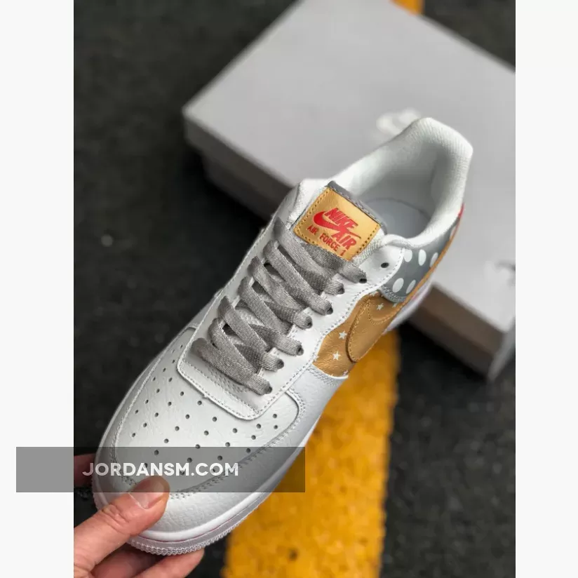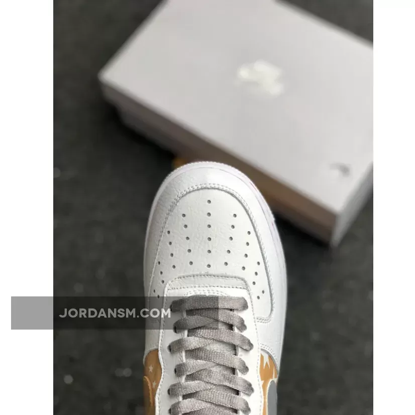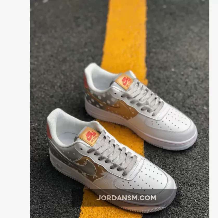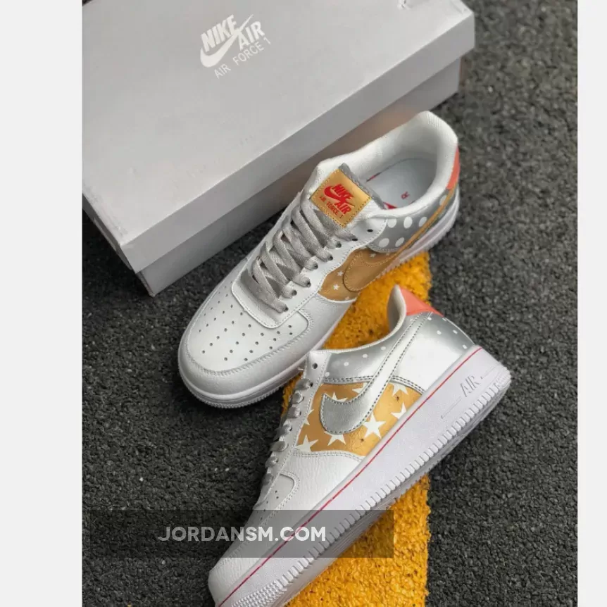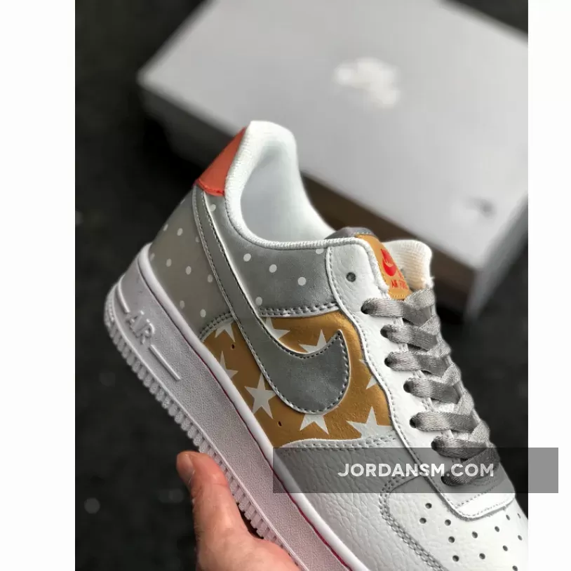 this Nike Air Force 1 Low comes with White leather across the upper while Tan lands on the panels with White stars. Following we have Metallic Silver on the ankle and heel area with White dots. Silver lands on the Swoosh and laces while Tan leather is applied to the tongue labels. Completing the look is a Red transparent heel tab.