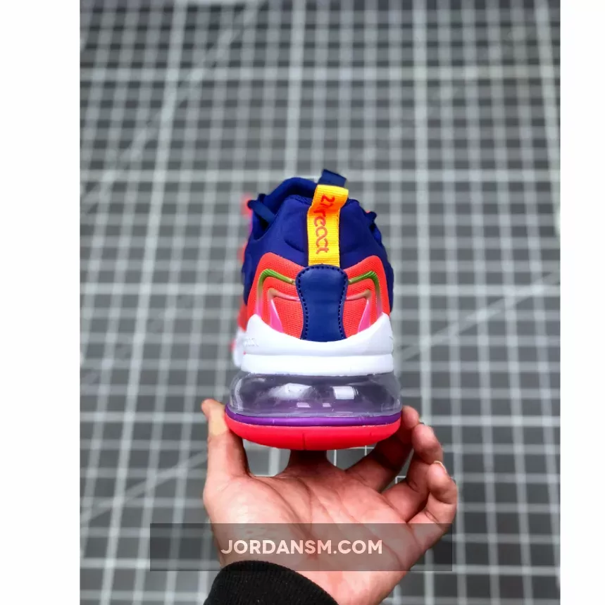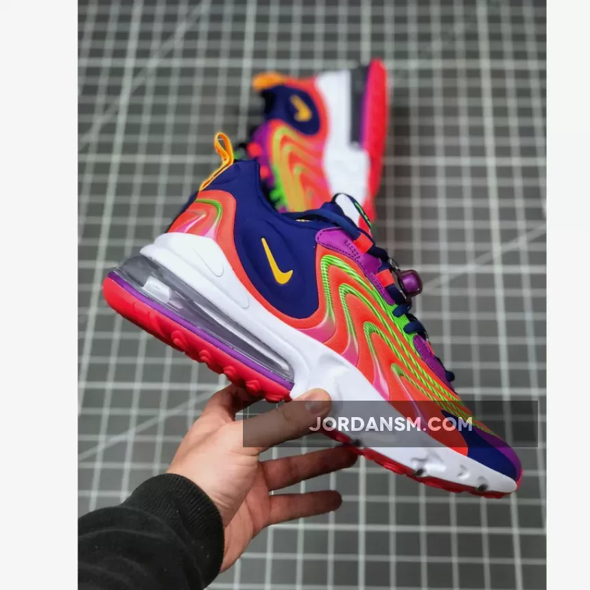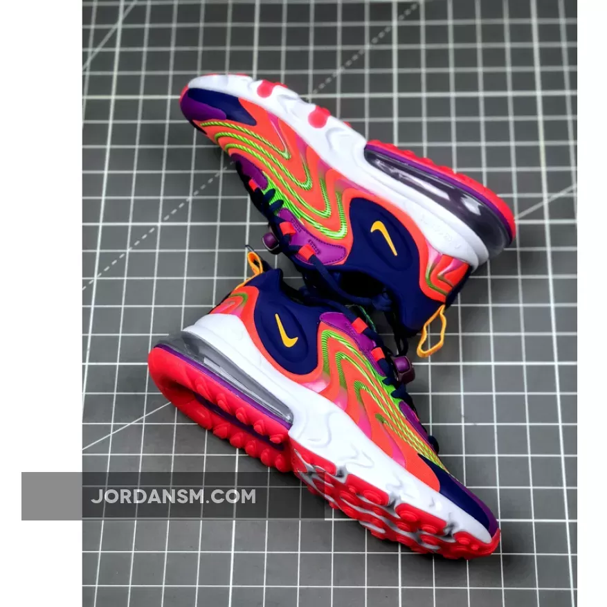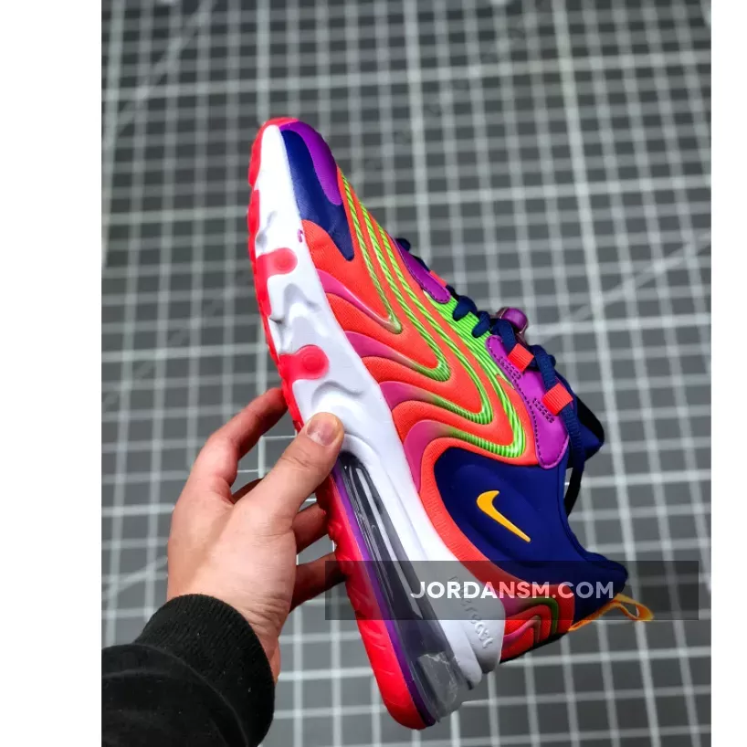 The Nike Air Max 270 React ENG “Laser Crimson” is another vibrant rendition of the newly-introduced silhouette which is dropping overseas tomorrow. The revamped model boasts a mesh construction on a large portion of the upper which is then offset by wavy curved plastic lines on the toe, side panels, and heel in a lime/orange gradient. Contrasting blue is also placed on the tongue, collar area and toe cap, alongside purple accents throughout. Finishing details include a new lace lock, a white React midsole with a translucent Air Max 270 heel unit, and a pink rubber outsole.