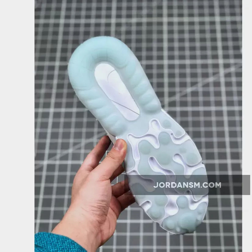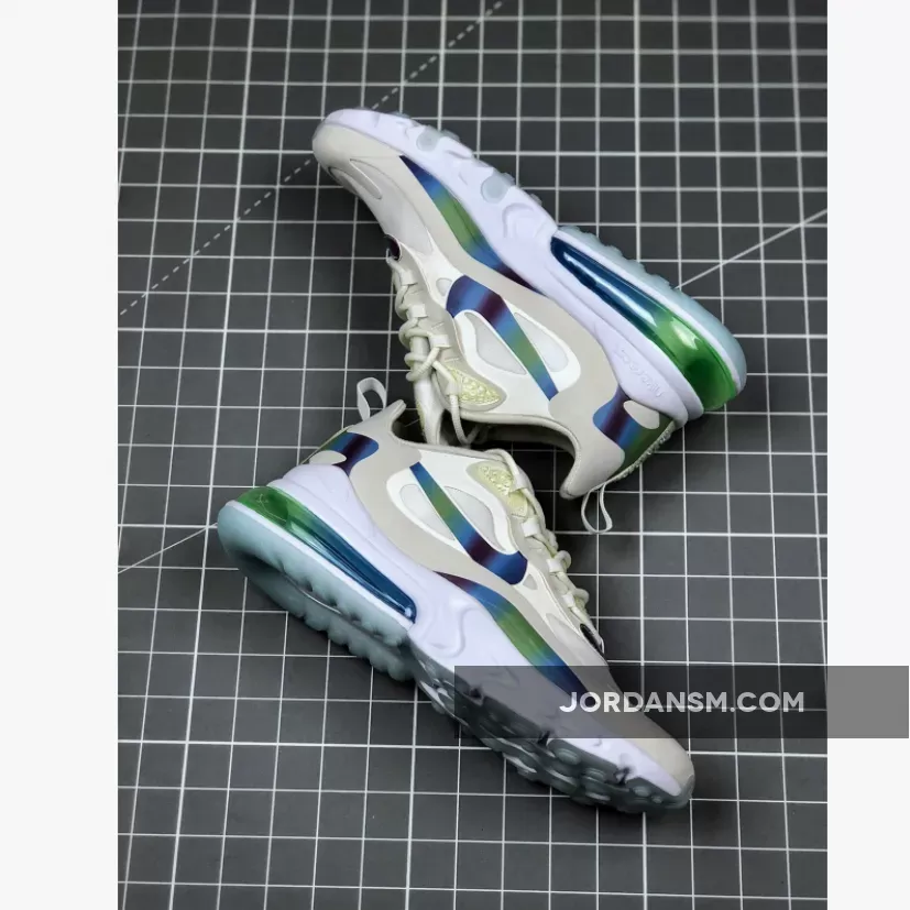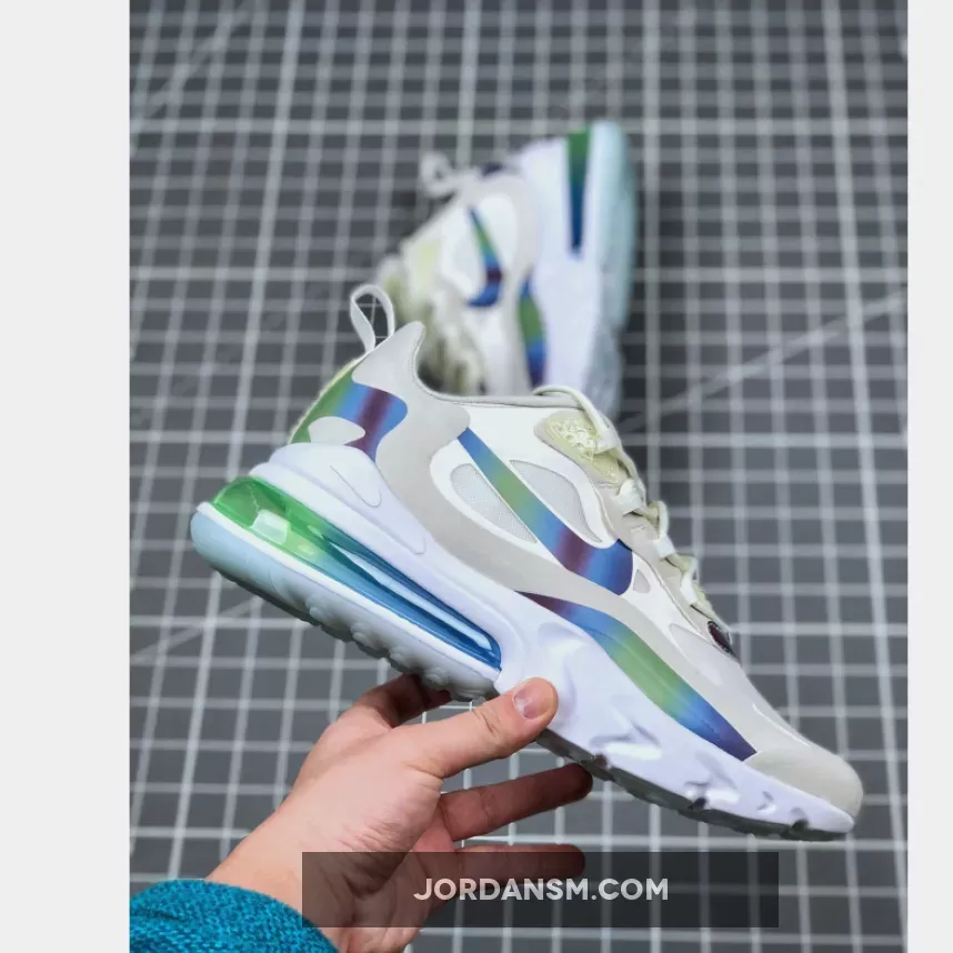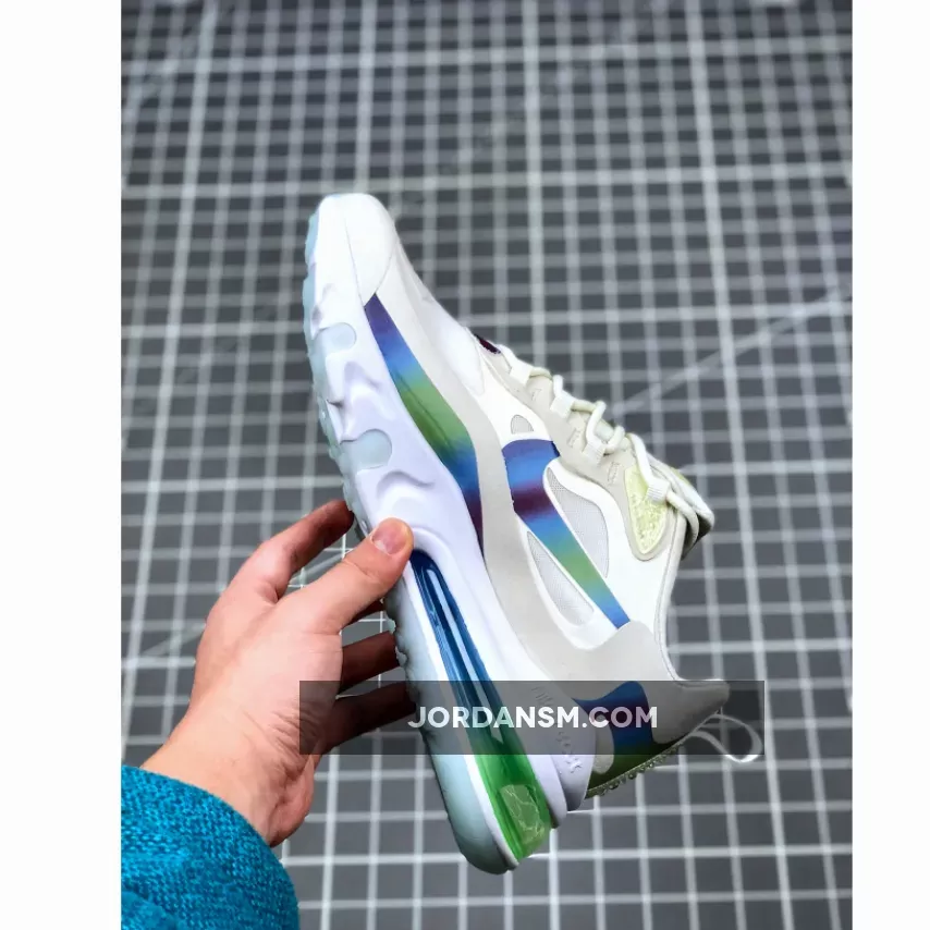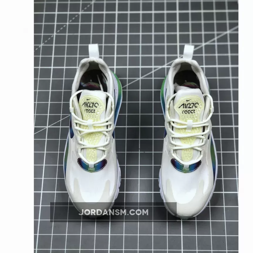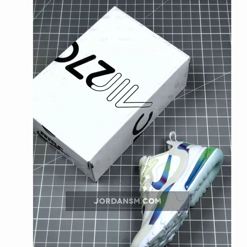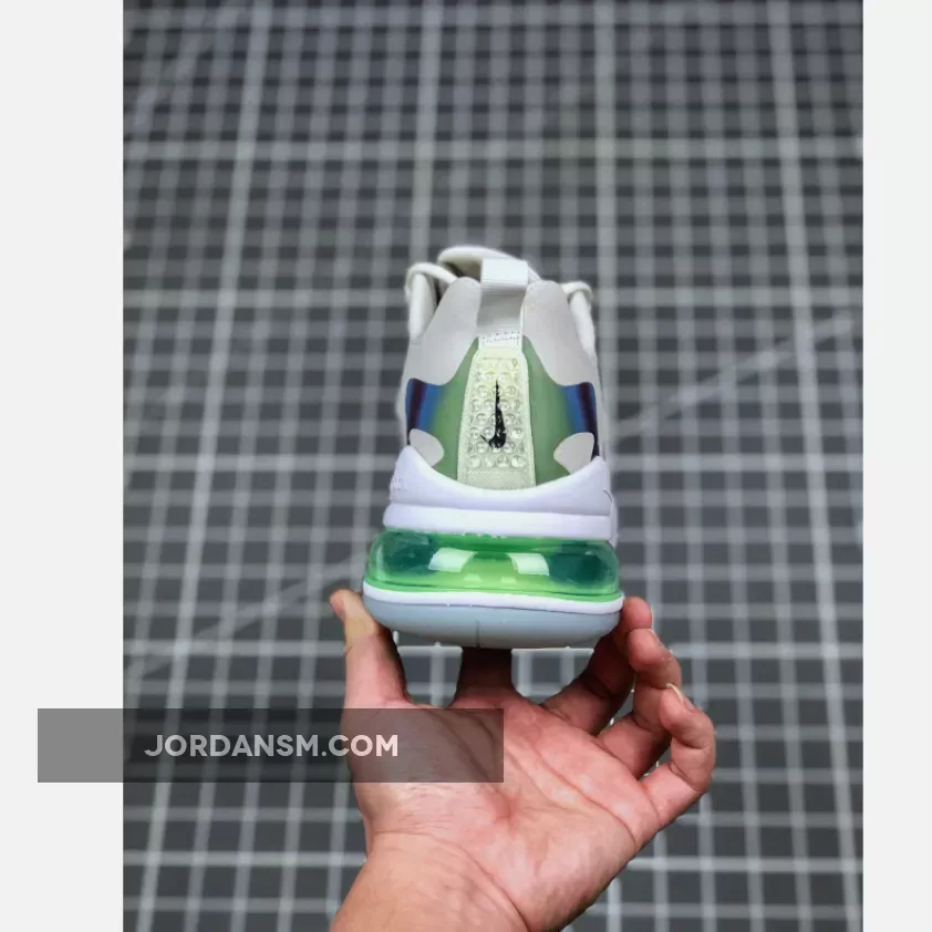 The smooth and vanilla shade of white from this React 270 is a soothing flavour. Similarly, the lemon green accents add to the fresh and tangy vibes. The lemon hues mix up with blue and purple as well. The Nike Swoosh on the sidewall and the overlays follow the same cue. But don’t miss the green AIR blob. Finally, bubble-wrap texture on the midfoot and tongue tab complete the look.