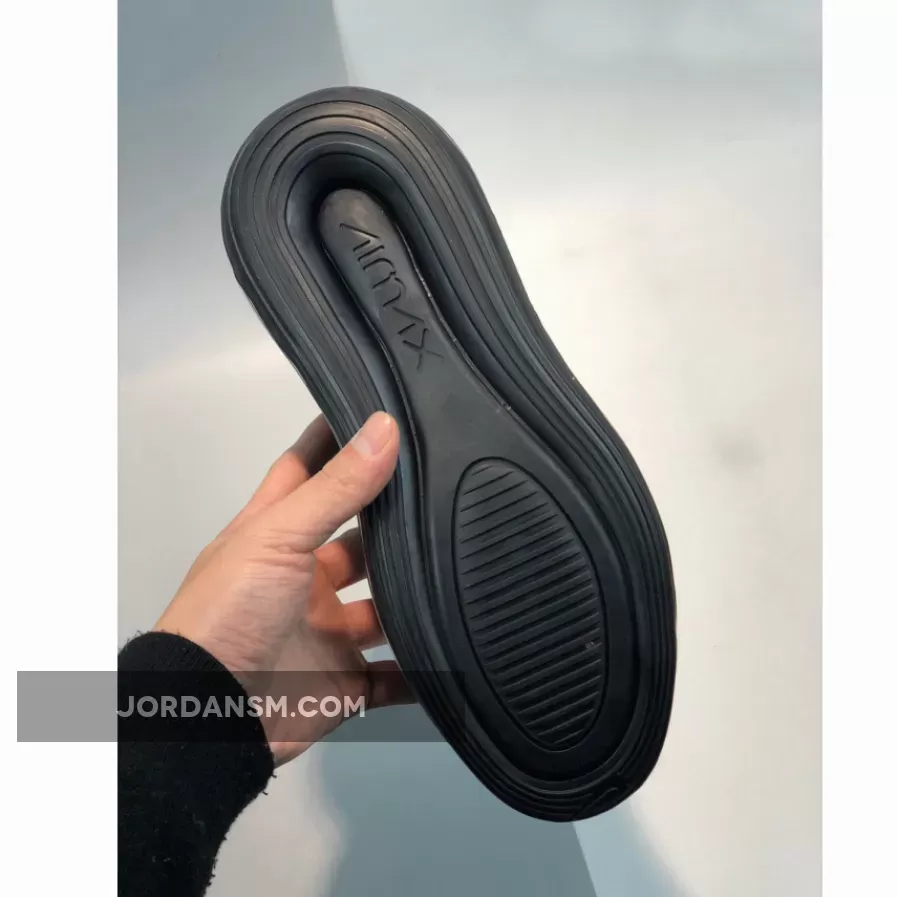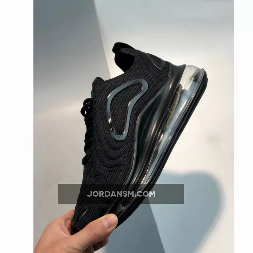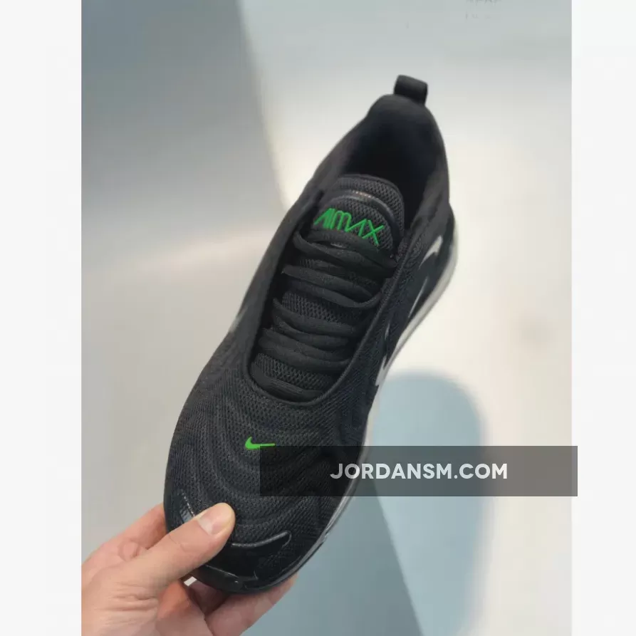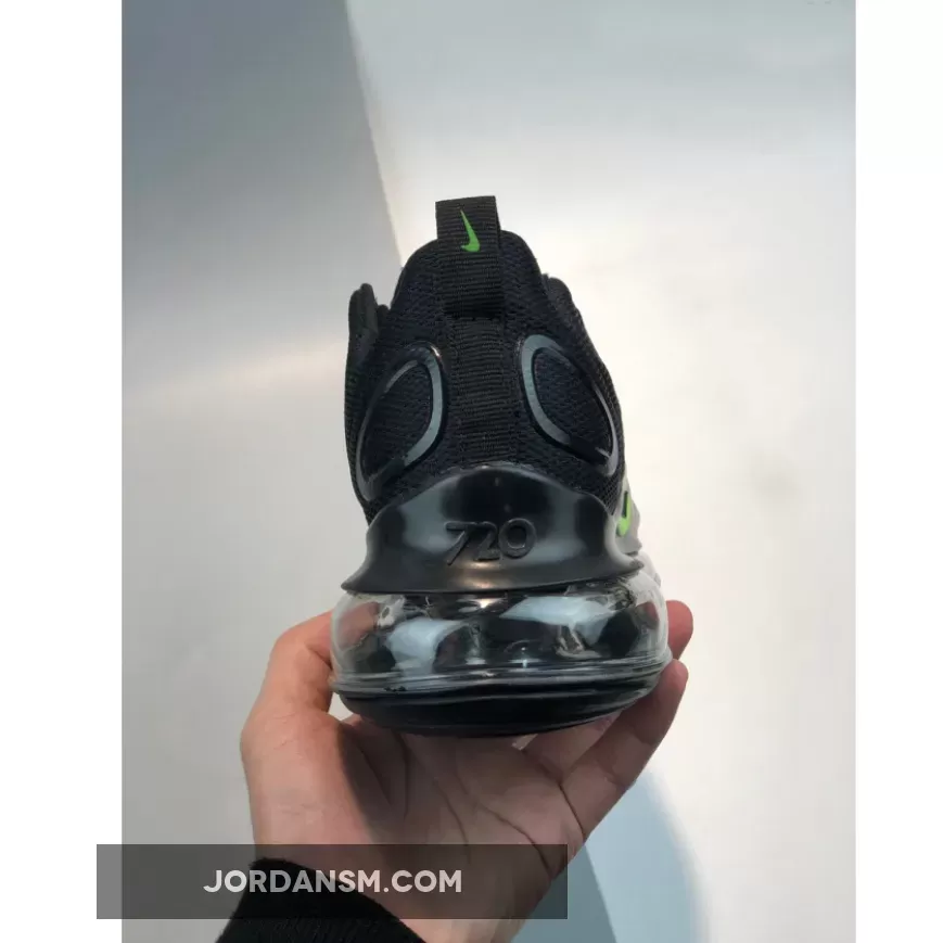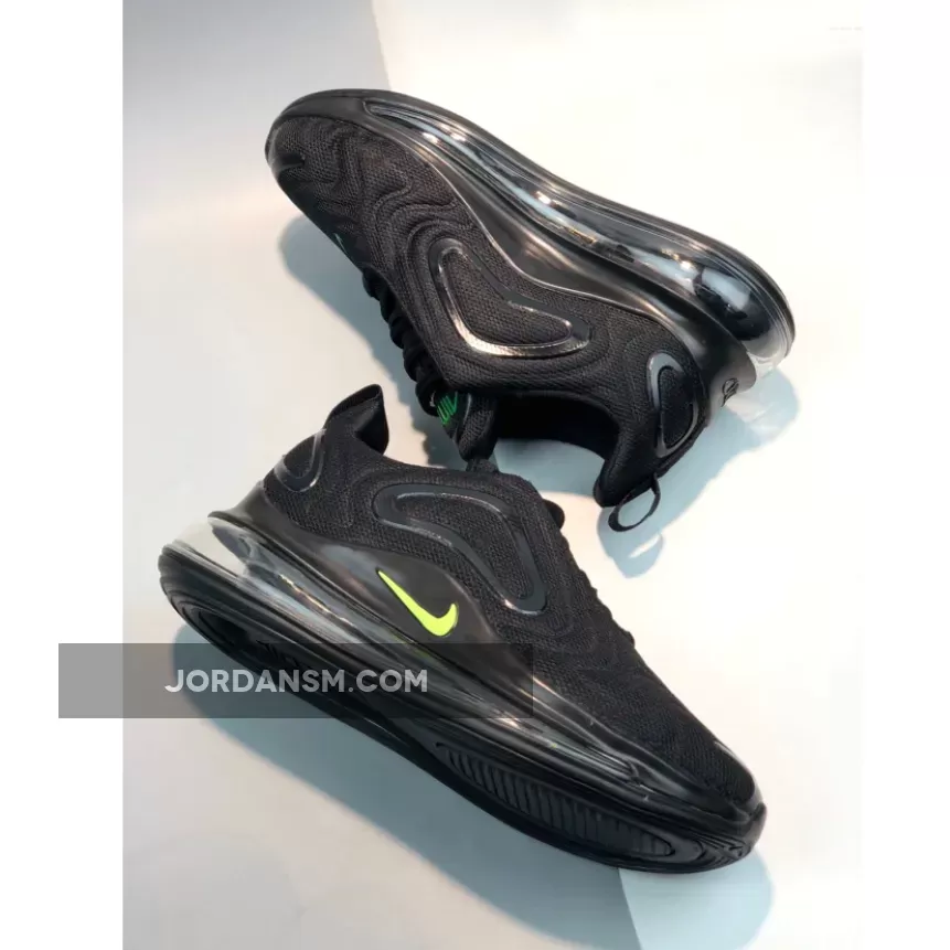 It features an all-Black mesh upper with matching plastic overlays. Volt contrasting accents are used on the tongues, Swoosh logos, and back pull tabs completed with a clear Air Max 720 sole unit.