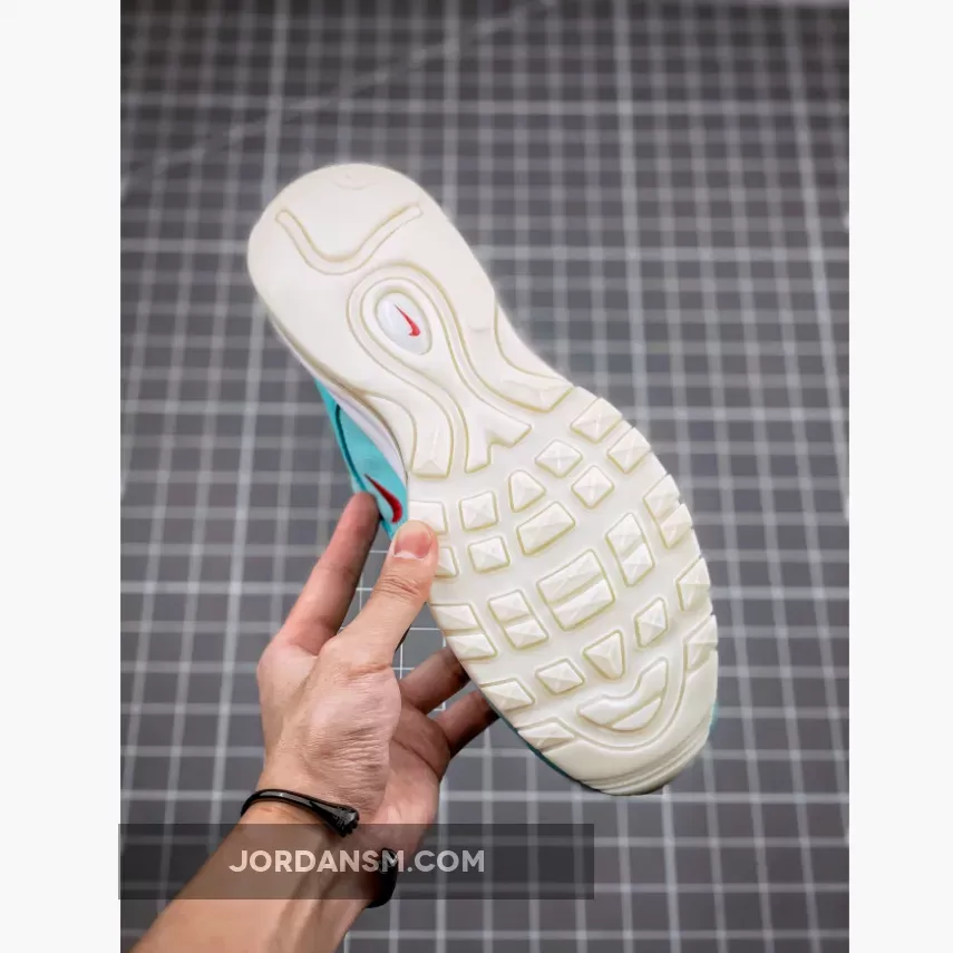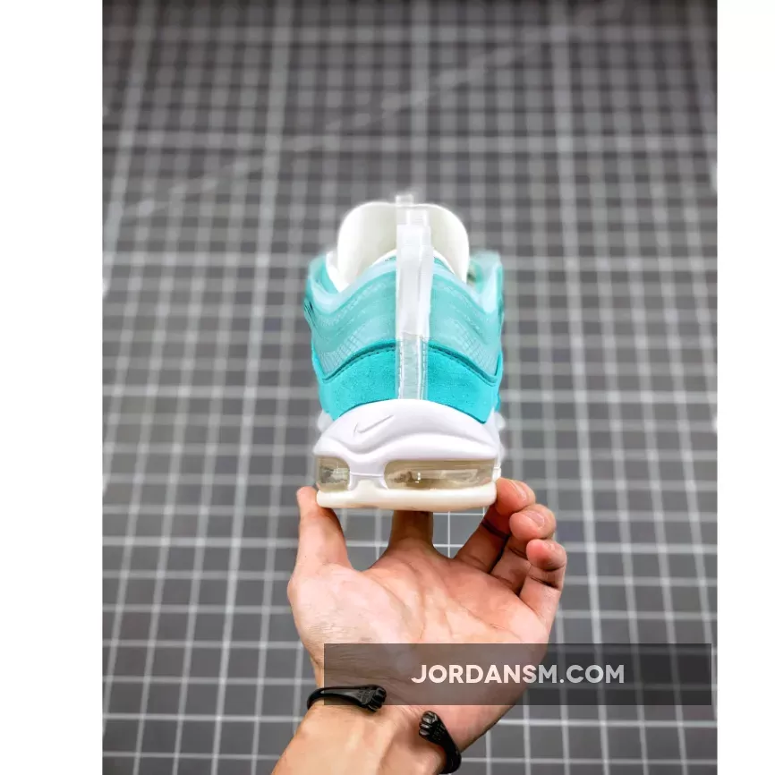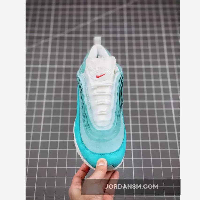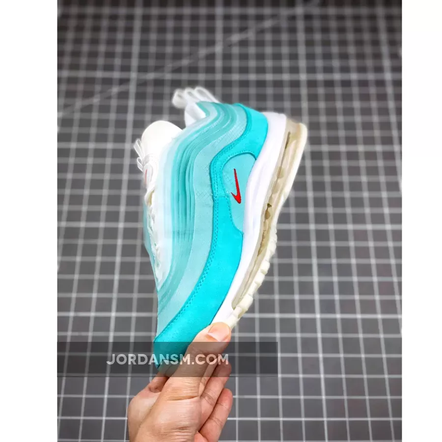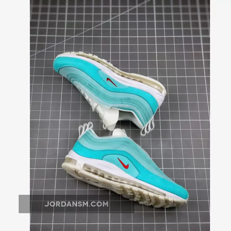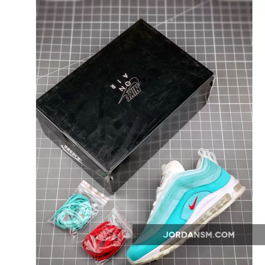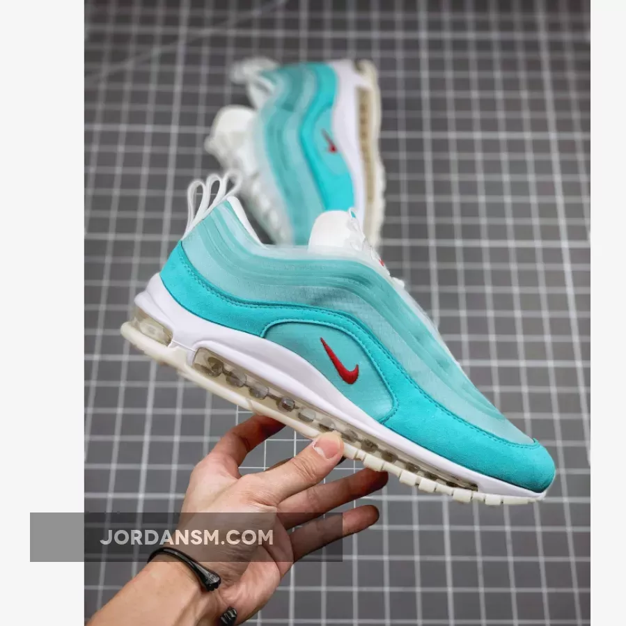 this Nike Air Max 97 features multi-layered upper which is paired with a Blue translucent upper, suede on the mudguard and White accents. In addition we have Red branding on the tongue and panel. Following we have multiple tongue and heel pull tabs, White placed within the Air Max unit and three Swoosh logos on the insoles.