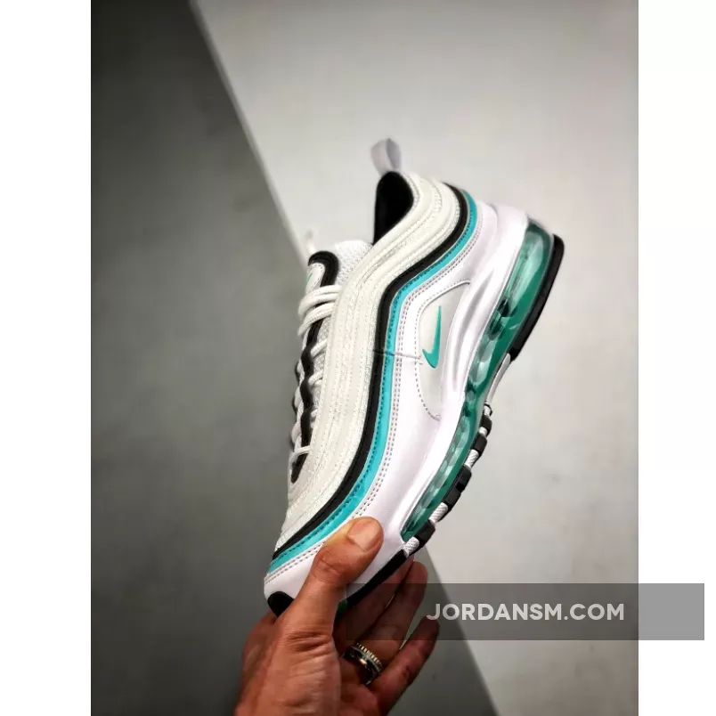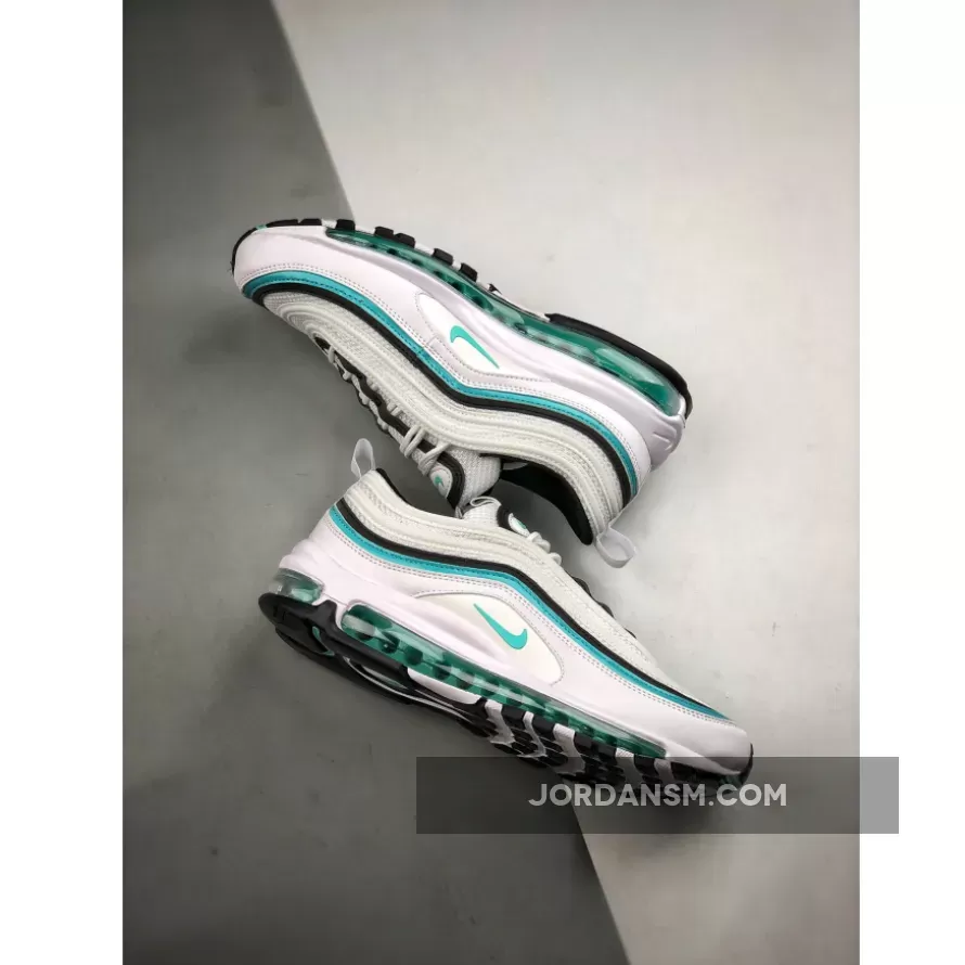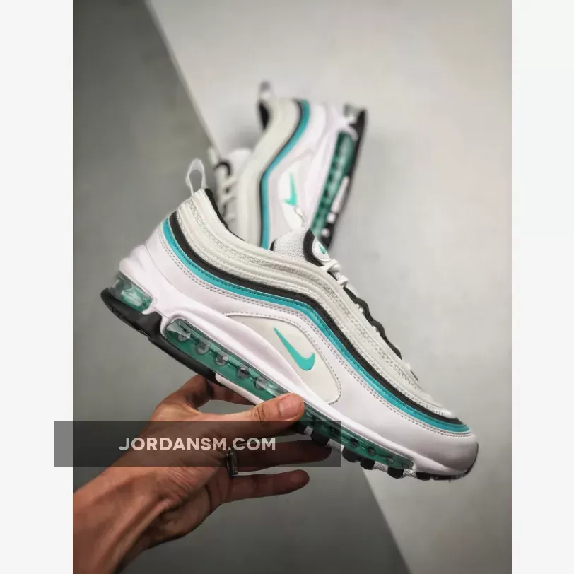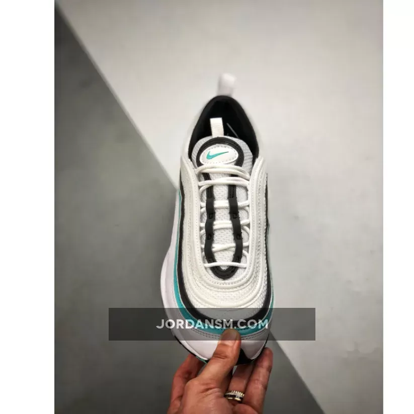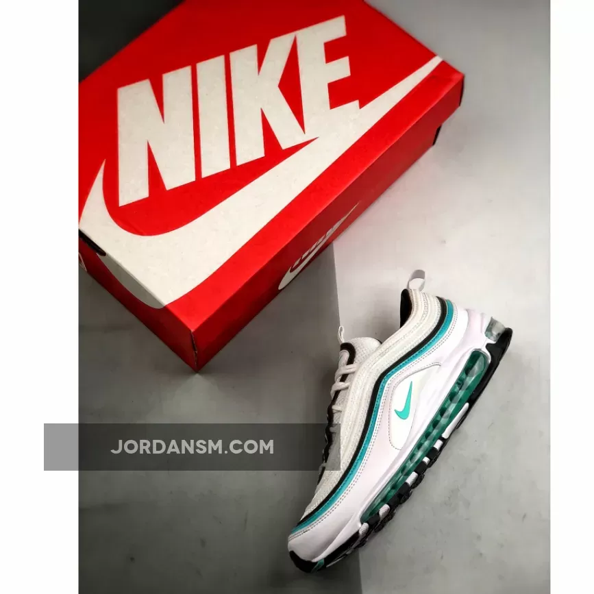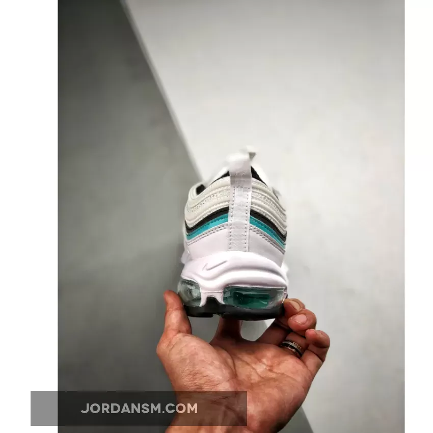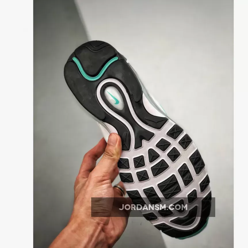 Looking closer this Nike Air Max 97 comes highlighted with White mesh across the upper while the same shade covers the leather mudguard. Both Black and Aurora Green leather lands on the overlays as well as some of the smaller details while 3M Reflective completes the look.