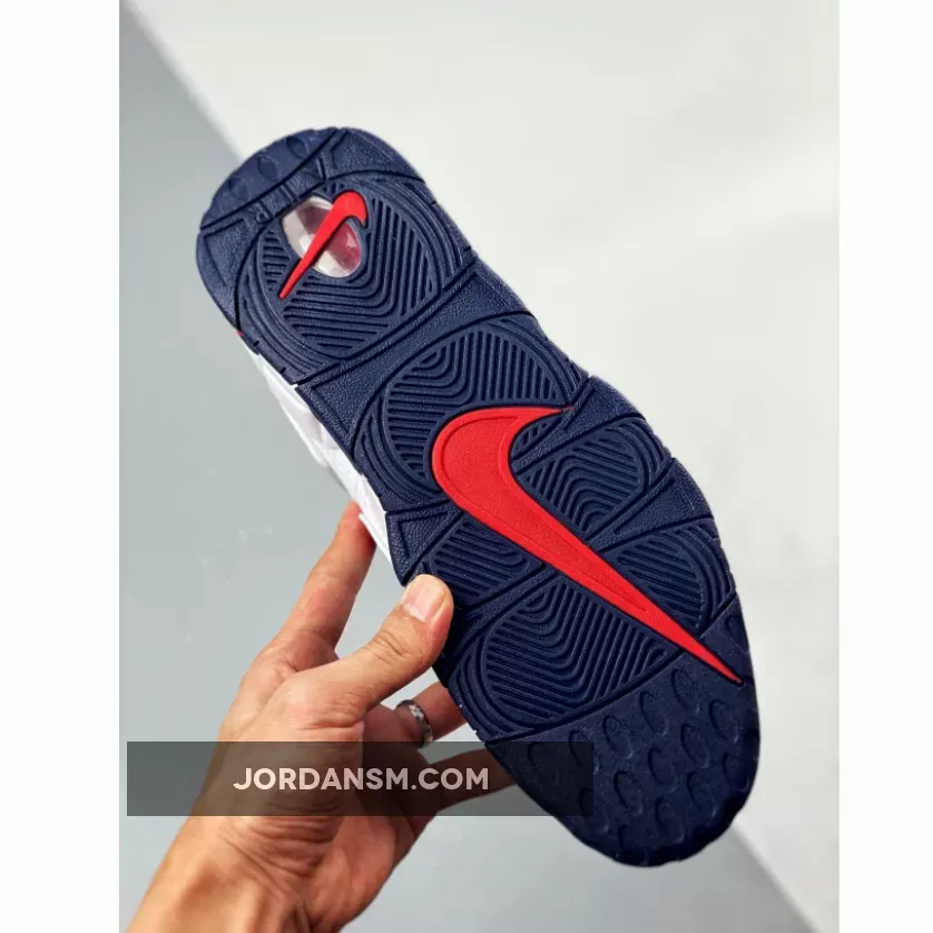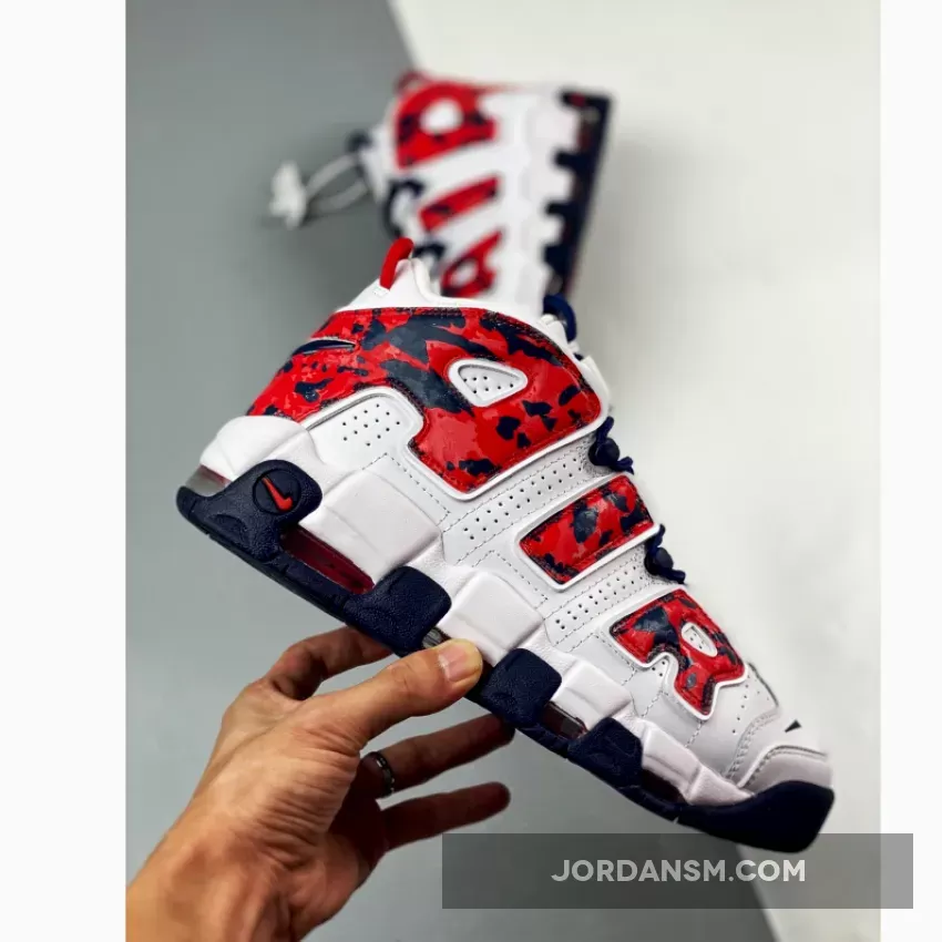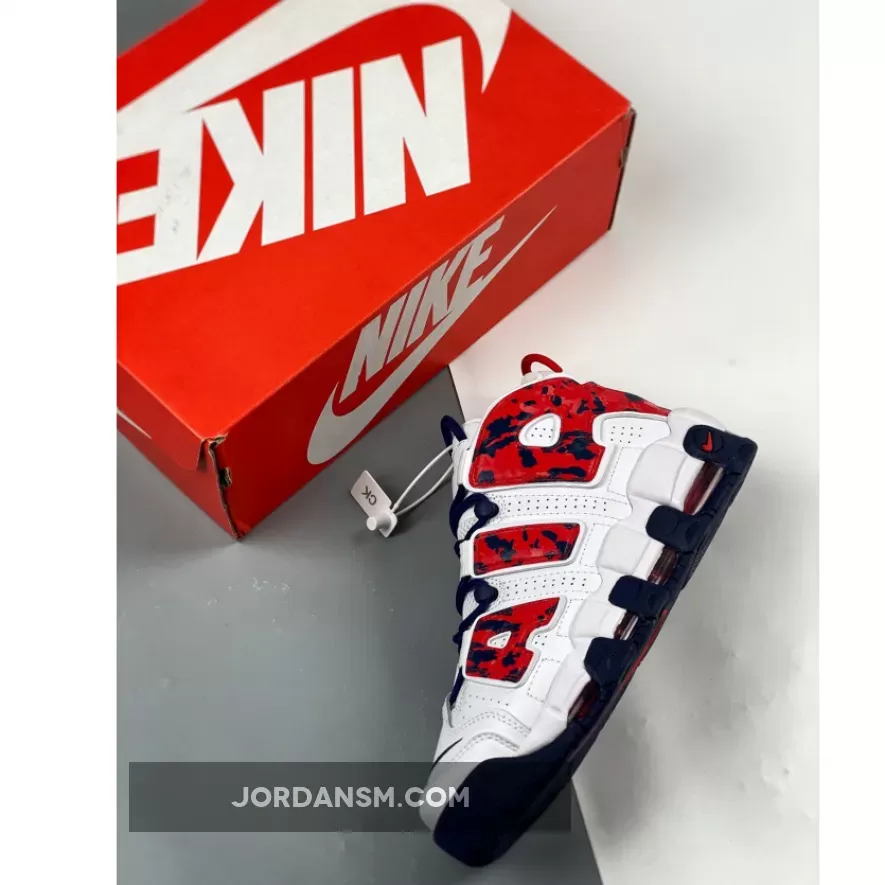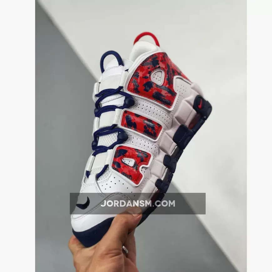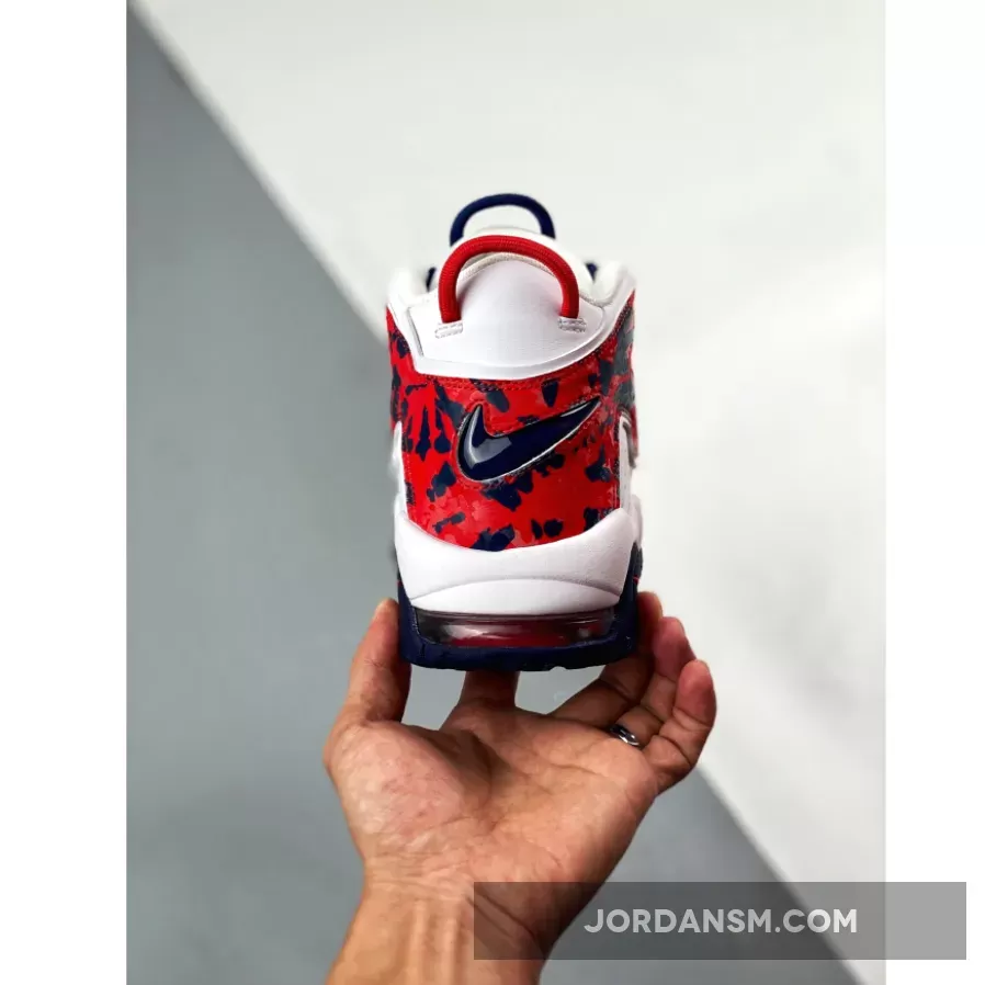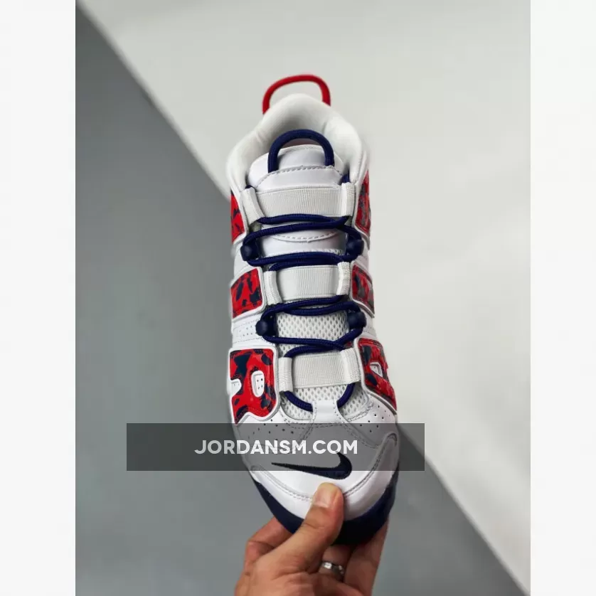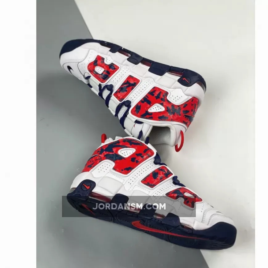 Dressed in USA colors, this Nike Uptempo features a White leather upper with mesh tongues and perforations on the sides. Red and Navy contrasting accents throughout with a camo-like print on the oversized “AIR” branding completes the design.