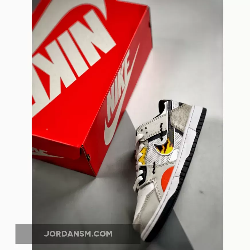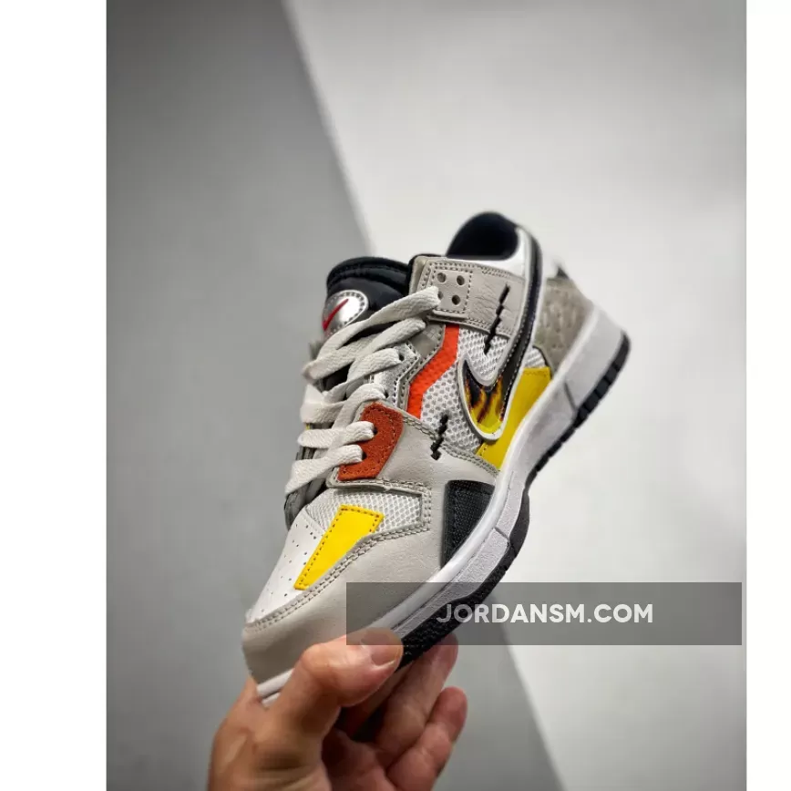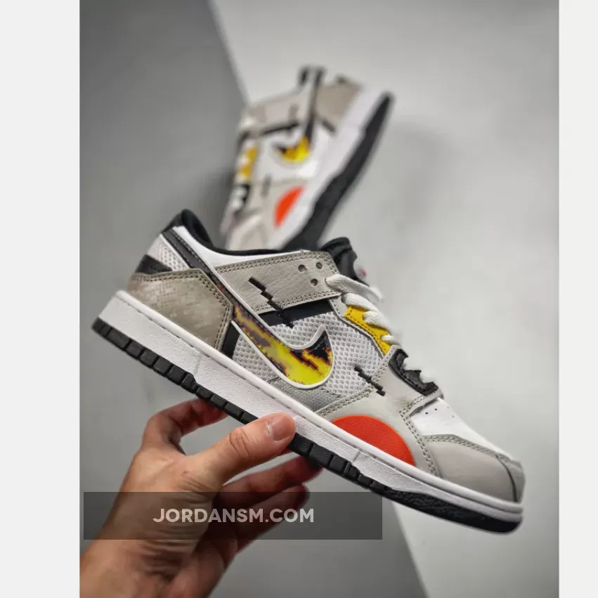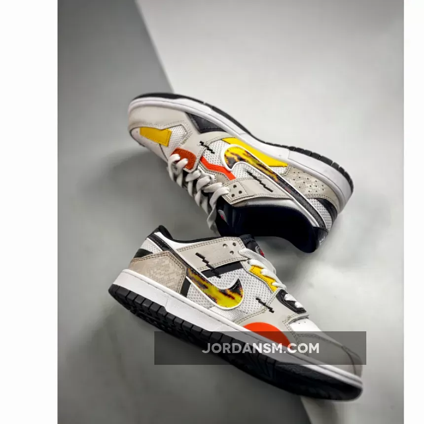 The anime-inspired “Mighty Swooshers” x Nike Collection gains a new addition with this Nike Dunk Low Scrap. Noted in grade school sizing, this Nike Dunk Low Scrap features a predominantly White and Grey color combination of mesh and leather with design highlights including 8-bit stitching, flame Swooshes, Silver tongue plate with Red Swooshes, and “The Battle of Dimension Six” and “Nike And The Mighty Swooshers” printed on the insoles. Finishing details include black, orange, and yellow accents throughout, white rubber midsoles, and black rubber outsoles.