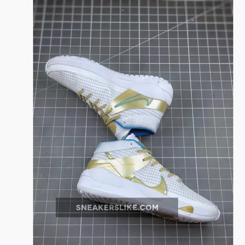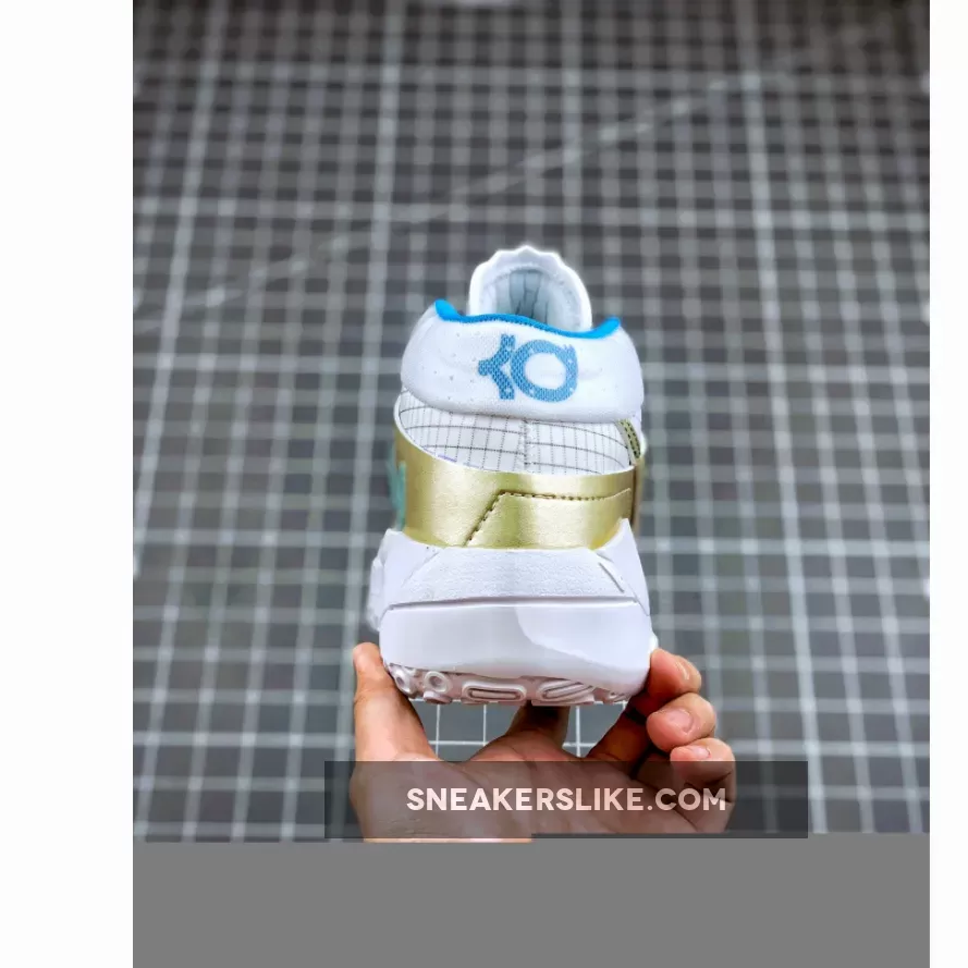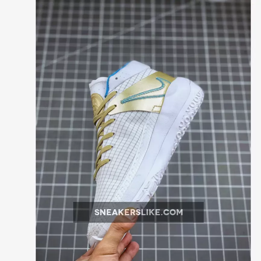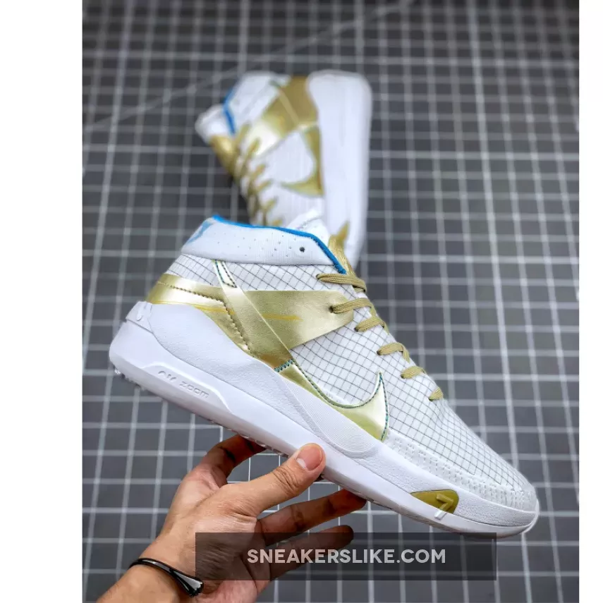 Aptly dubbed Nike KD 13 “EYBL,” this offering features a white upper detailed with a gold grid pattern. The metallic golden hue follows onto the Swoosh insignias, mid panels, and laces. Elsewhere, contrasting icy blue dresses the sock liner, co-branding on the heels and tongues. This all sits atop a fresh white midsole.