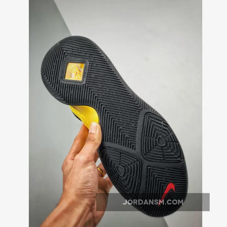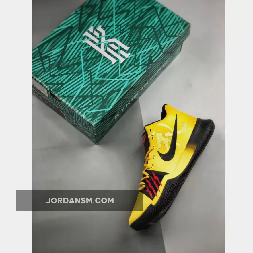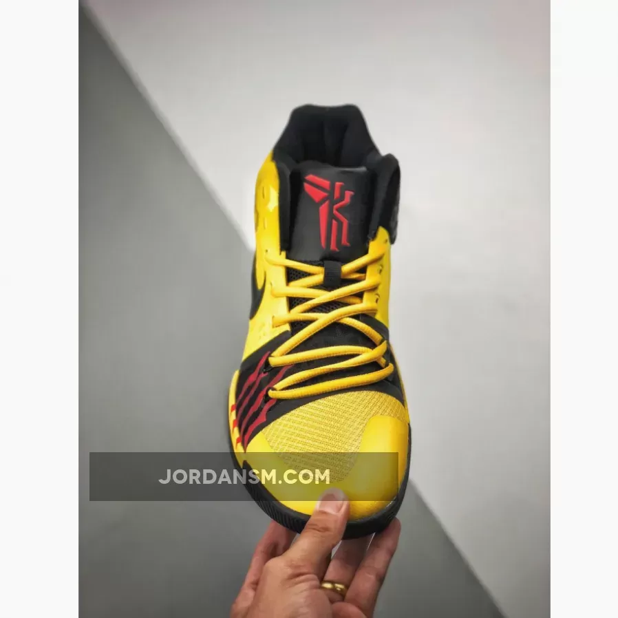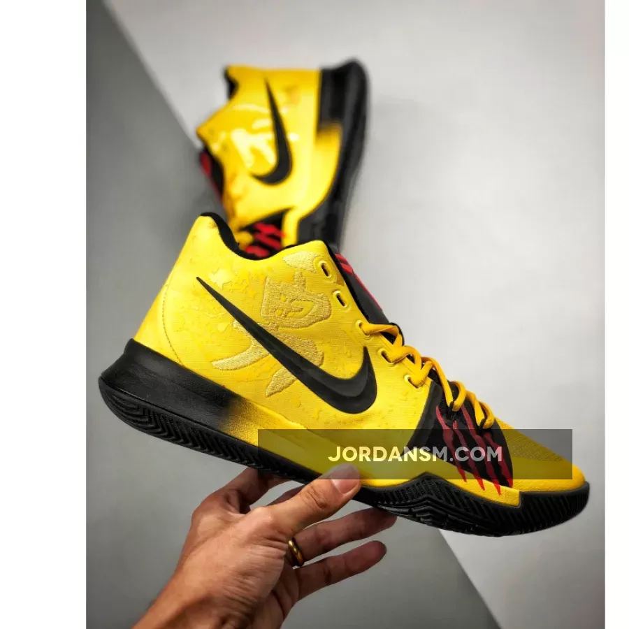 The new Kyrie 3 Bruce Lee features the following elements that modernize the original Kobe 5, which remains one of Irving’s all-time favorite shoes. The Yellow and Black contrasted upper pays tribute to Lee’s trademark colors. Four Red slash marks connect to Lee. A snakeskin-inspired medial side represents the Black mamba, fading to Samurai on the lateral side for Kyrie – a metaphorical torch passing. The new Kyrobe logo fuses Bryant and Irving’s Nike logos into one. Lastly, the Samurai textile print on the lateral side is similar to the pattern on the initial Kyrie 3 colorway worn by Irving in a big 2016 Christmas day win.