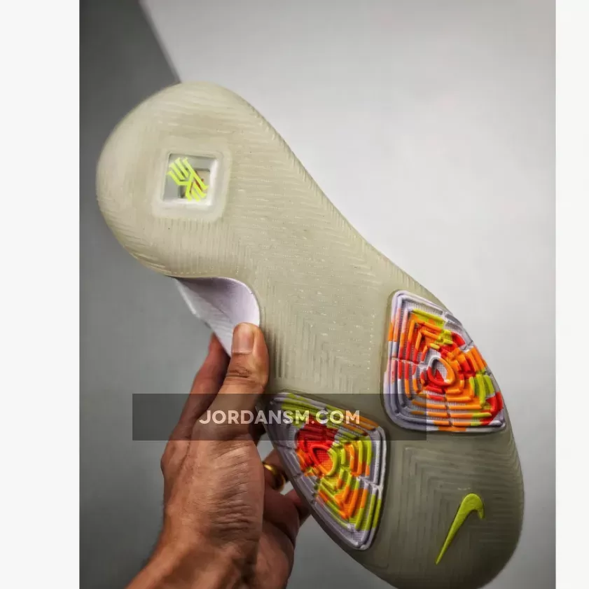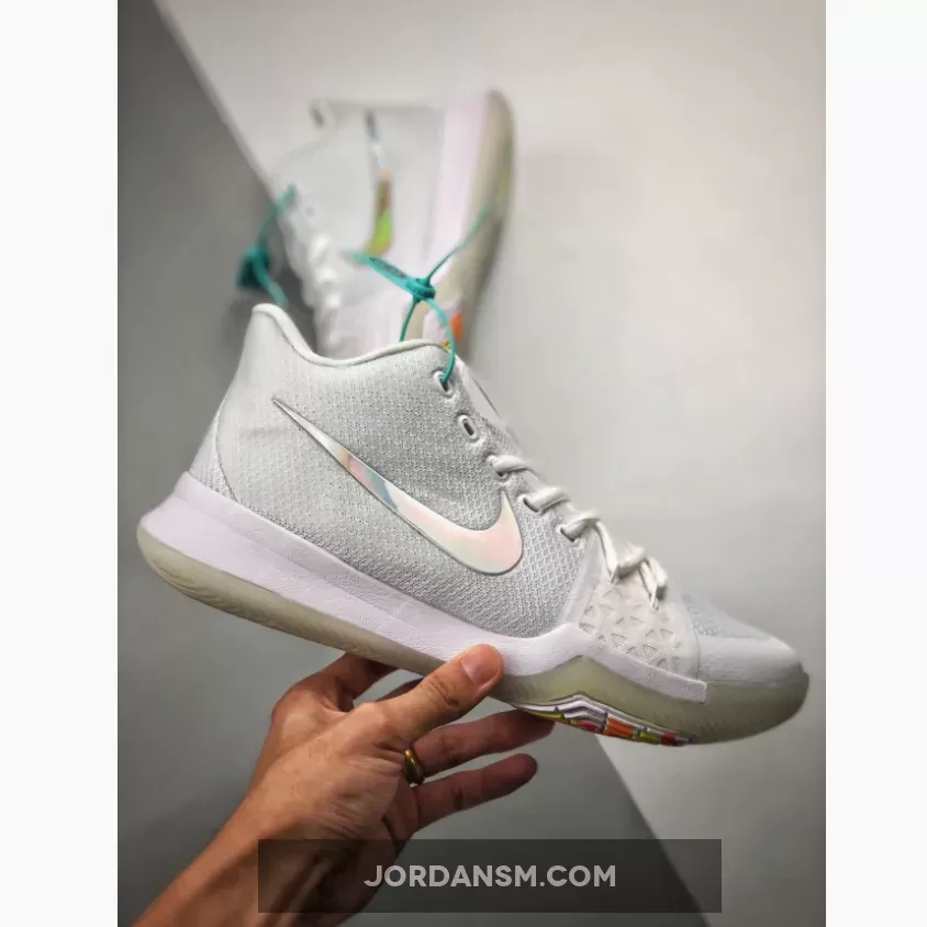 Dressed in a Pure Platinum, Multicolor, and Volt color scheme. This Nike Kyrie 3 features a full Pure Platinum mesh upper that’s highlighted with Iridescent Nike Swoosh logos.