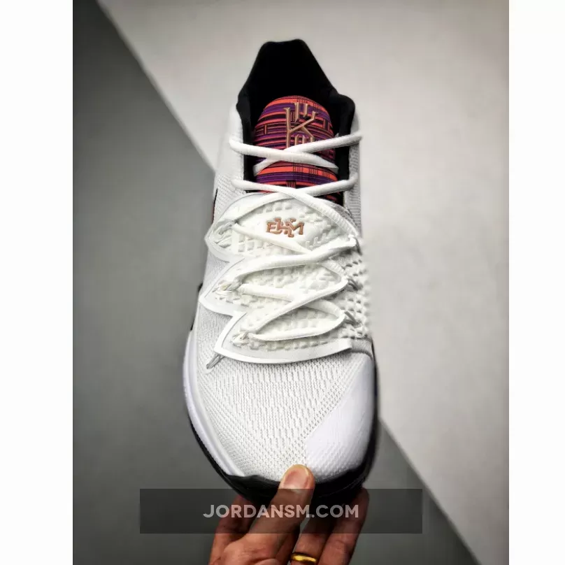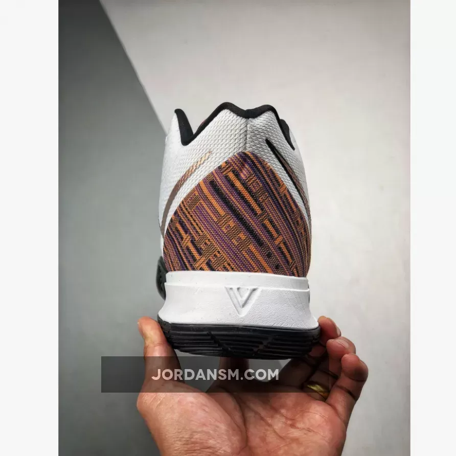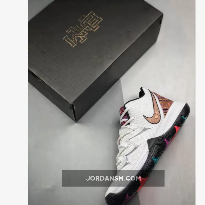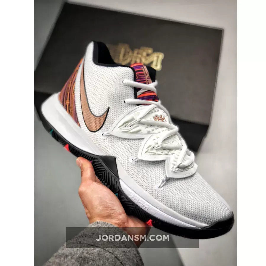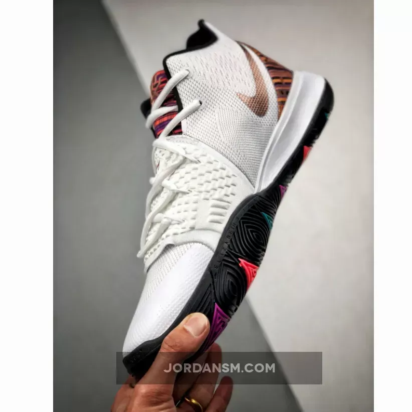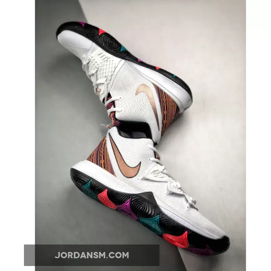 this Nike Kyrie 5 comes dressed in a White and Metallic Red Bronze color theme. This pair is a tribute to Kenyan culture and features a vibrant embossed graphic on the Nike Swoosh, around the heel and tongue. Other details includes Gold branding, Black on the midsole and Multicolor hints on the outsole. Nike Kyrie 5 BHM Color: White/Metallic Red Bronze Release Date: February 1, 2019 Style Number: BQ6237-100 Price: $130