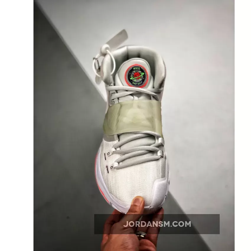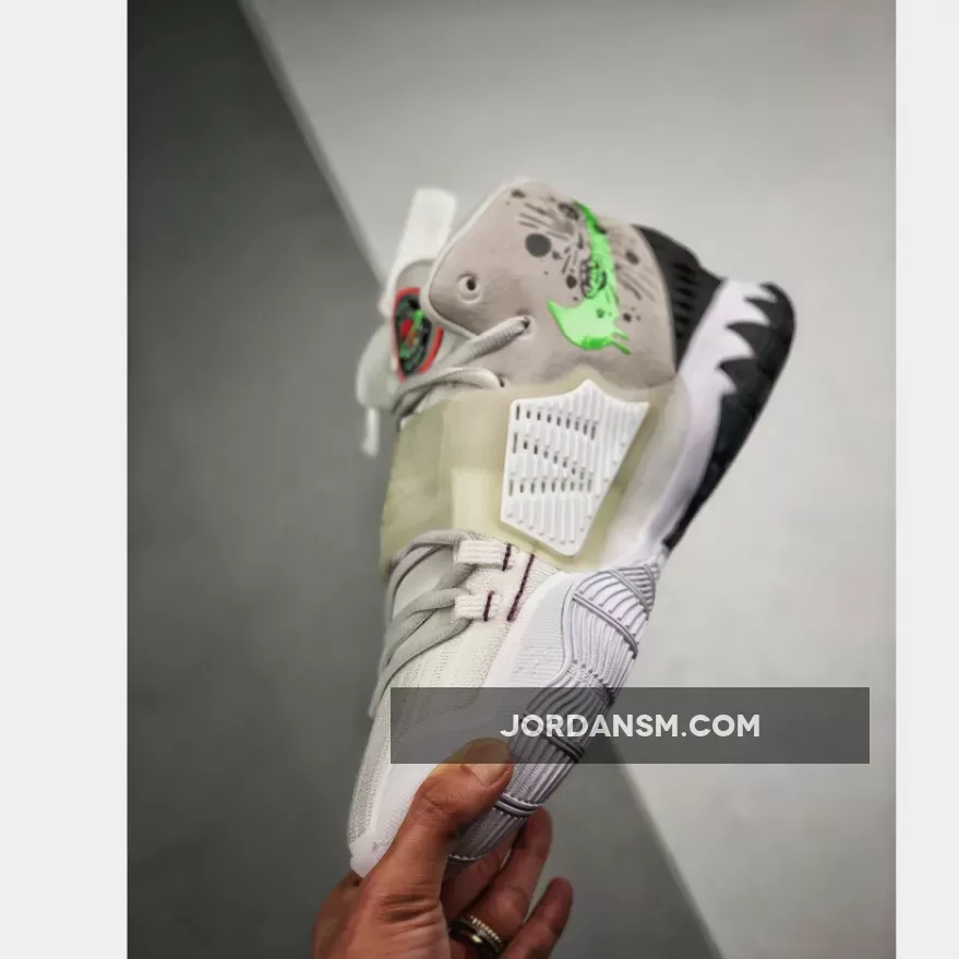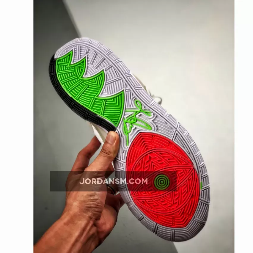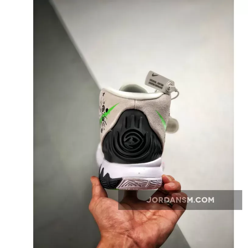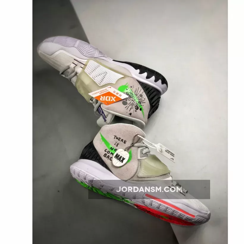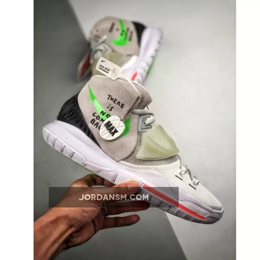 Dressed in a Photon Dust and Green Strike color scheme. This Nike Kyrie 6 features an engineered mesh upper detailed with glow-in-the-dark midfoot straps and Green slime Swoosh logos on the sides. Highlighting the shoe are Black embroidered “There Is No Coming Back” text on the lateral rear, along with a basketball logo embroidered on the toughen of the right shoe. A White midsole atop a White outsole with Orange and Green accents completes the design.