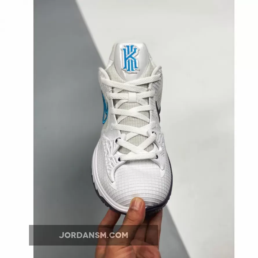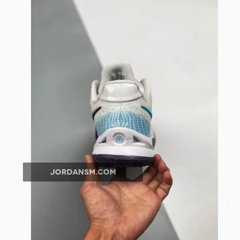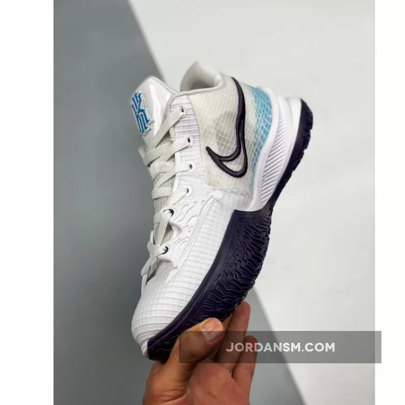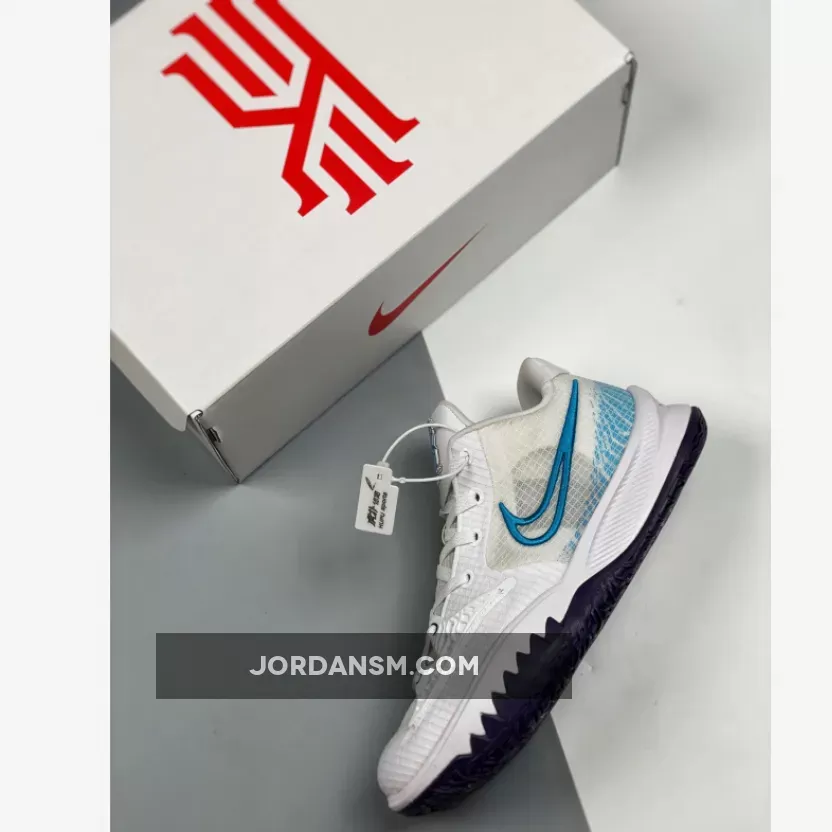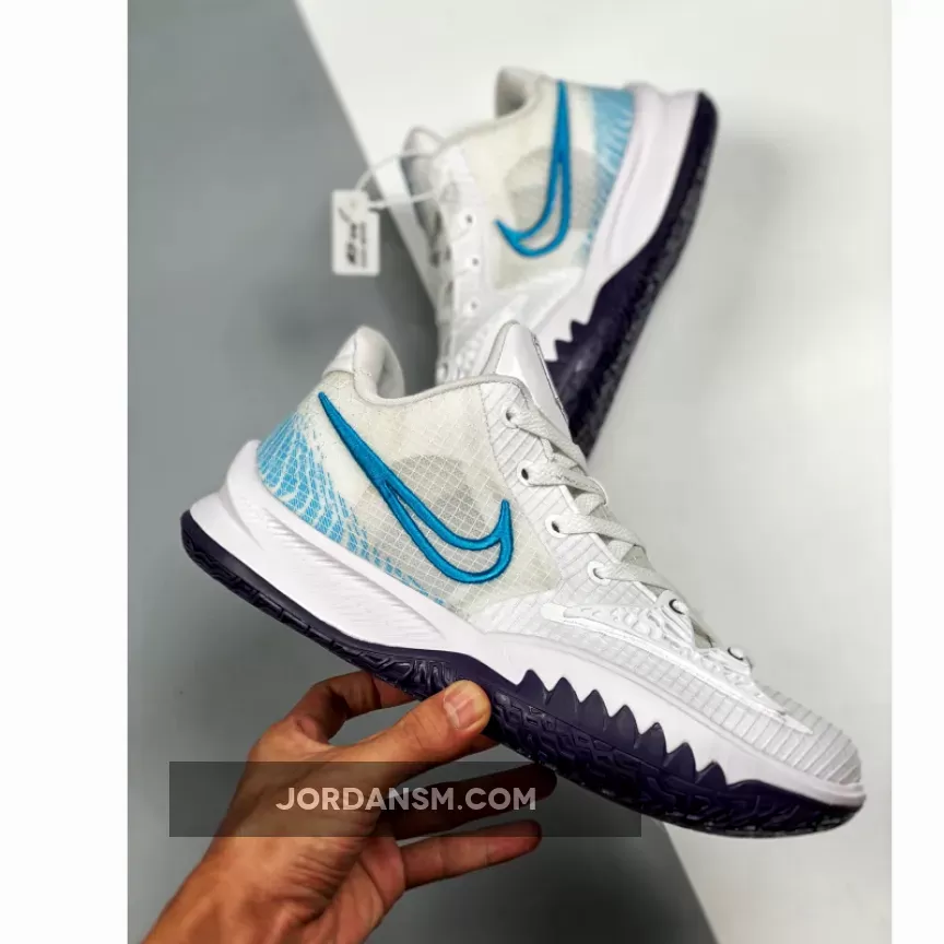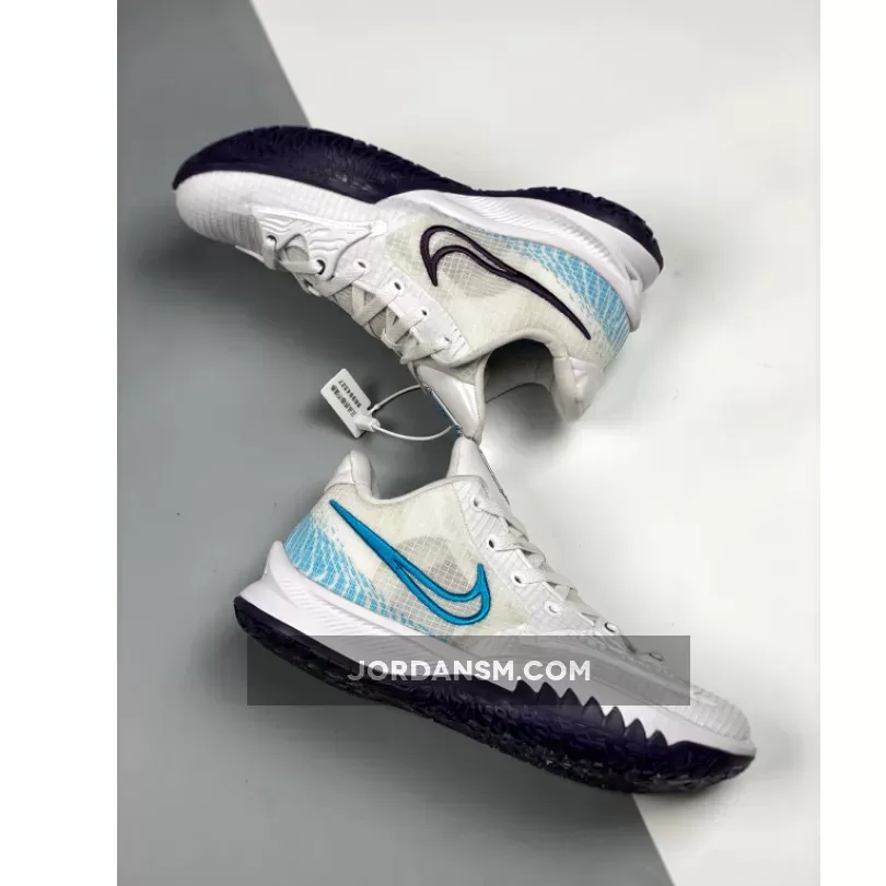 One of those comes dressed in a White, Laser Blue, and Dark Raisin color scheme. This Nike Kyrie Low 4 features a White upper with a molded cage overlay on the forefoot. Highlighting the shoe are Laser Blue contrasting accents with Dark Raisin embroidered Swoosh on the medial atop a matching rubber outsole.
