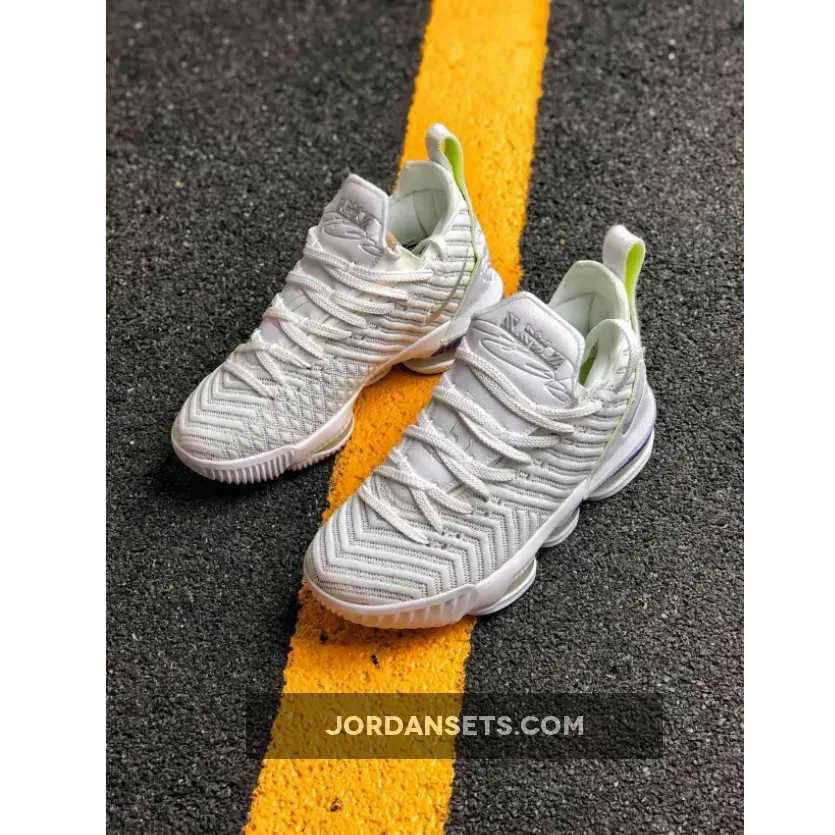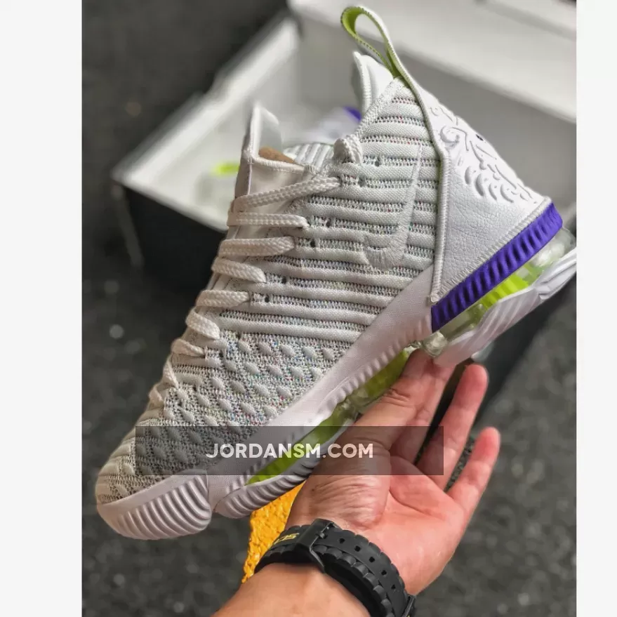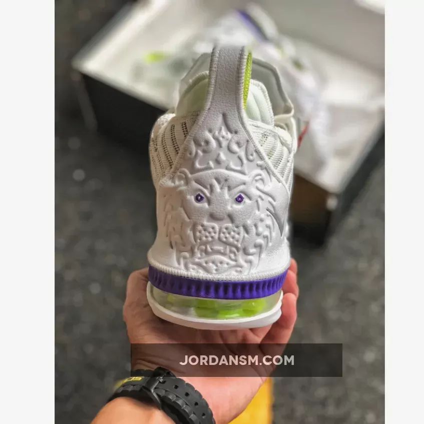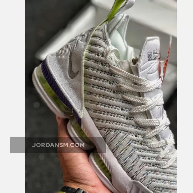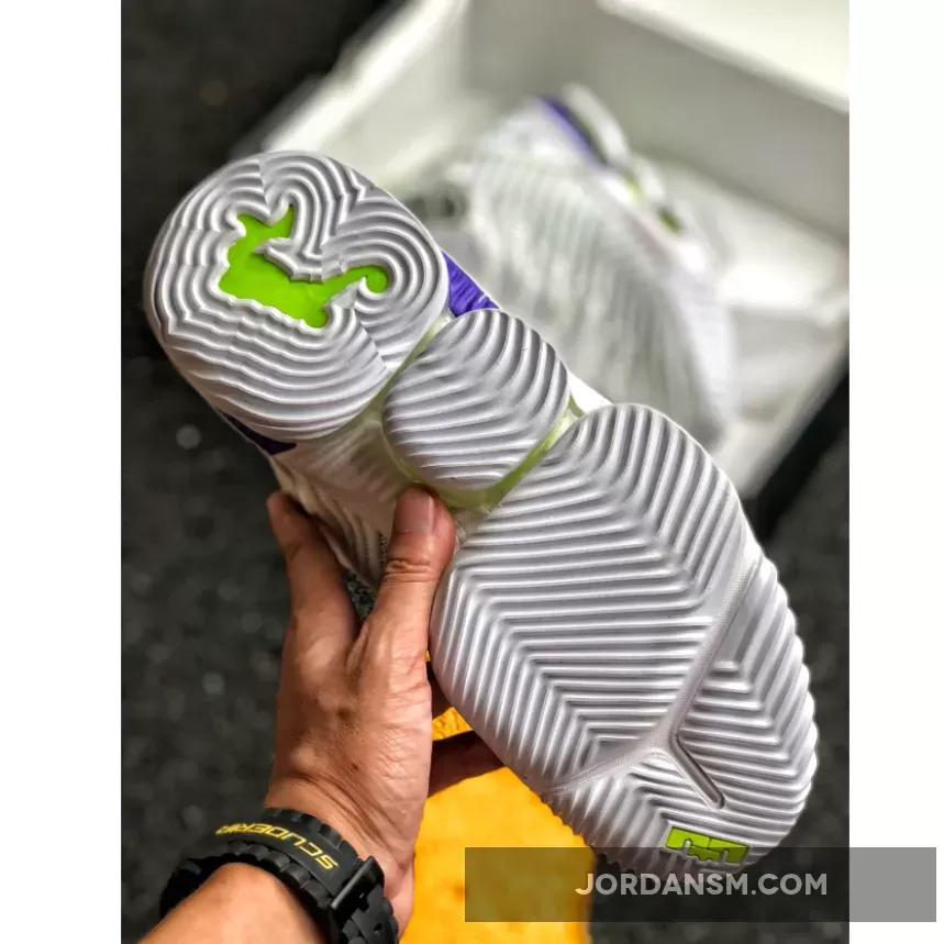 This Nike LeBron 16 comes dressed in a White, Multi-Color and Hyper Grape color combination. As you can see the overall color placement resembles that of Buzz Lightyear’s space outfit. Highlighted with a knitted upper, Silver on the Swoosh logo and tongues while leather is placed on the heel. Other details includes Green within the Max Air unit along with Purple just above it.
