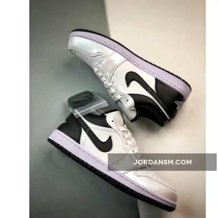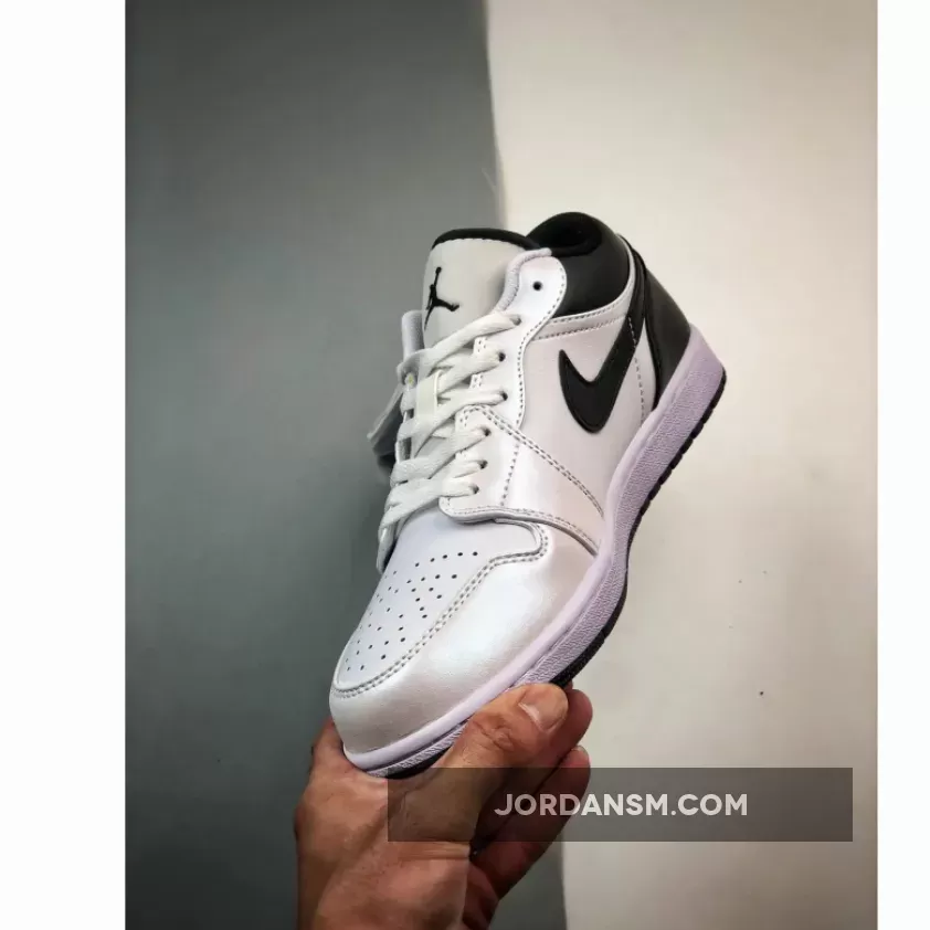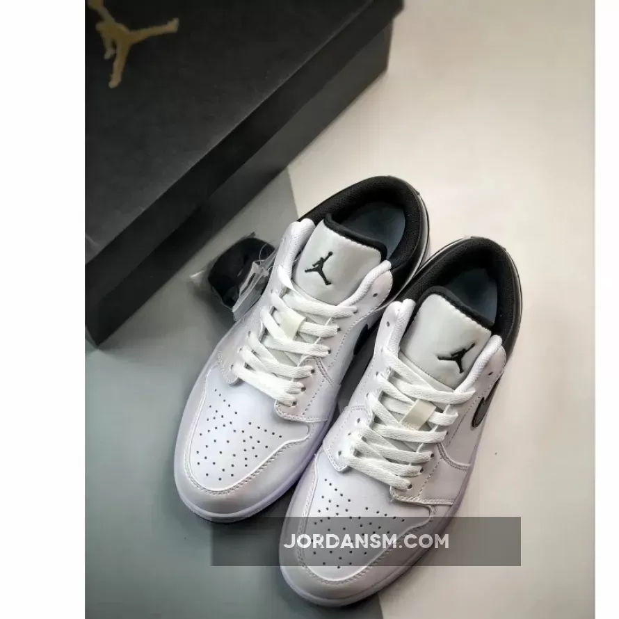 this Air Jordan 1 Low is primarily covered in white leather with contrasting black accents on the back half. Smooth white leather gracefully wraps around the toe box, mudguard, eyestays, and quarter panel. A black Swoosh cuts across the middle of the silhouette, placed between the black heel counter and collar. Additional black details are found on the sock liner and tongue lining. A black Jumpman logo adorns the tongue, while the signature Jordan Wings logo is finely embroidered on the heel in white. A white midsole and black outsole round out the stylish look of this timeless sneaker.