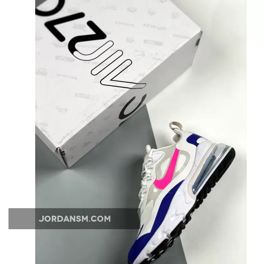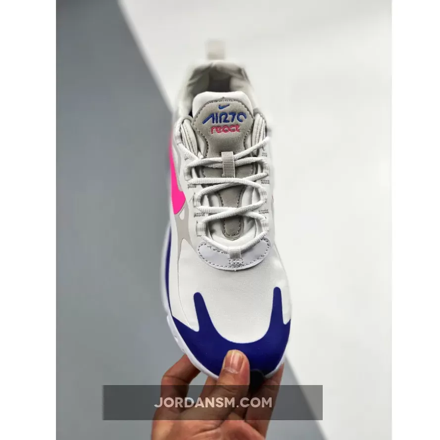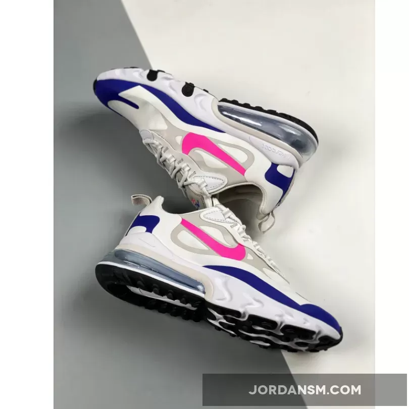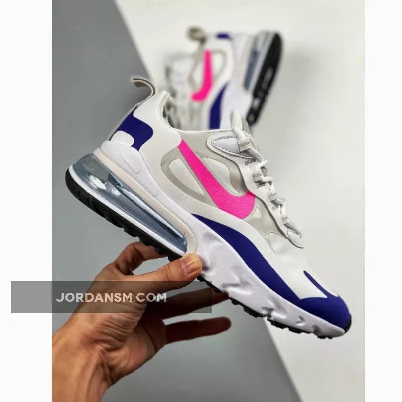 This Air Max 270 comes with White on the base while Navy wraps the toe and overlays the heel. Adding pop is the use of Hot Pink which covers the Swoosh logos o the panels and React branding on the tongue.