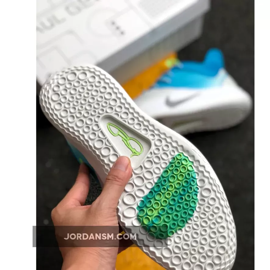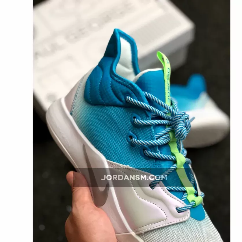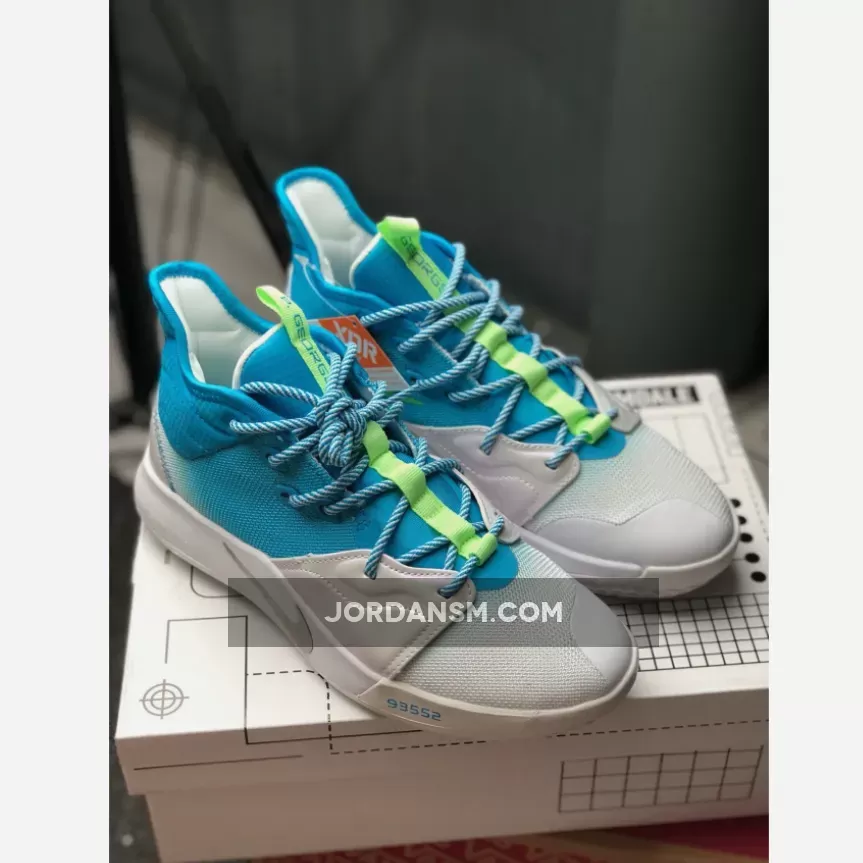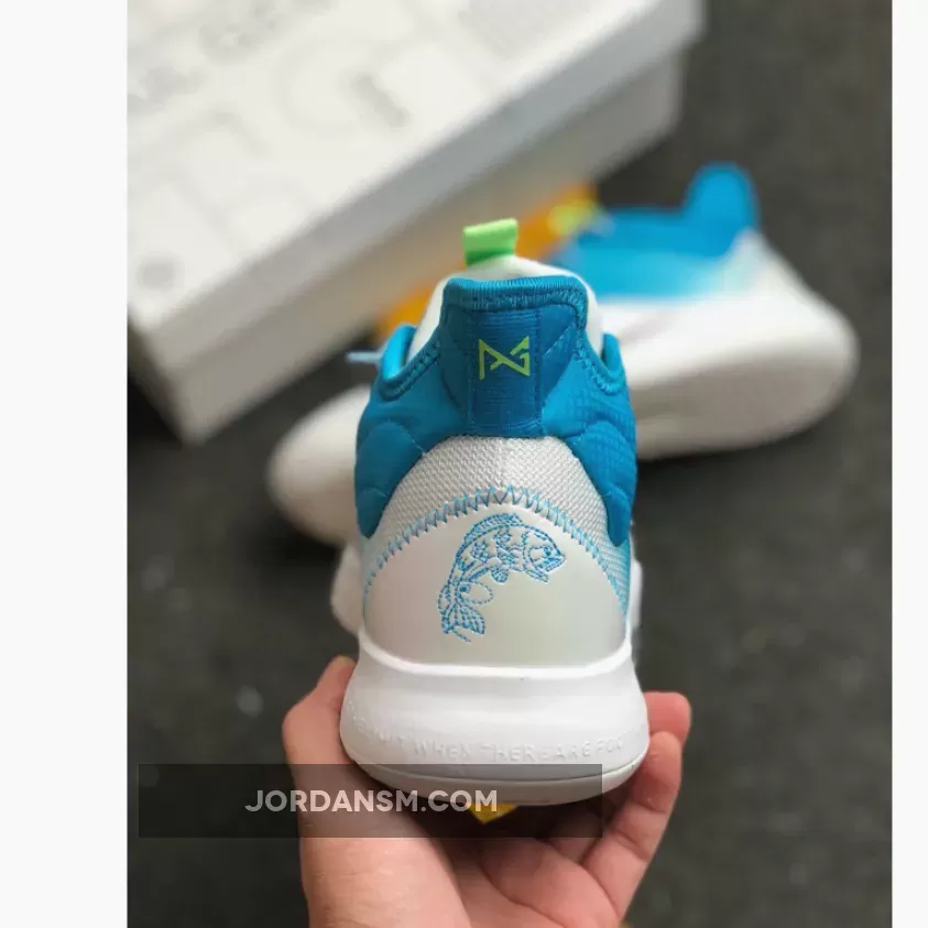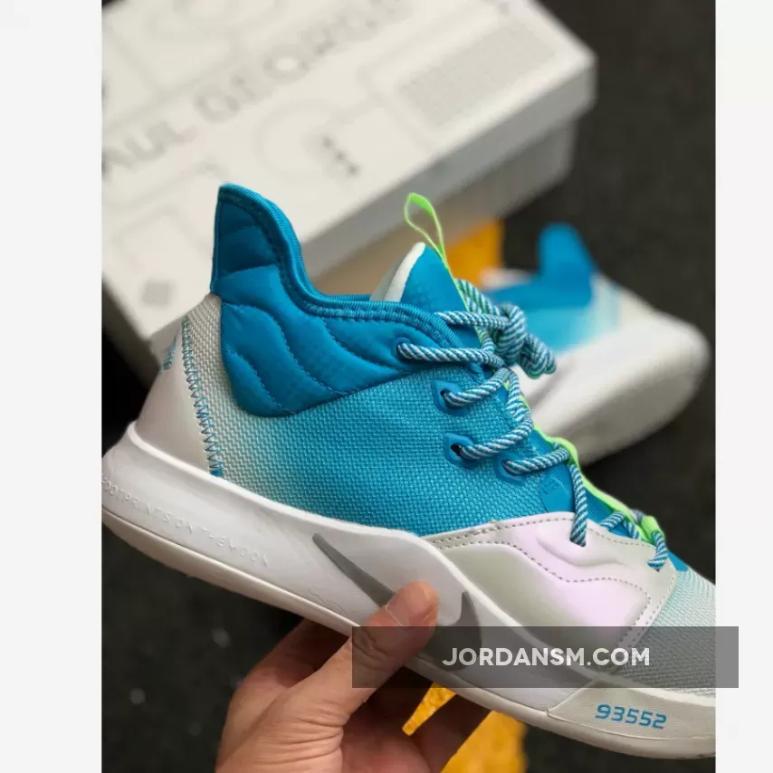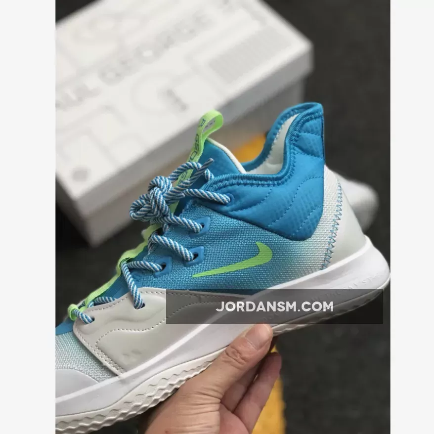 Dressed in a combination of water-themed color tones. This Nike PG 3 features a White mesh upper with Aqua Blue and Bright Green accents throughout.